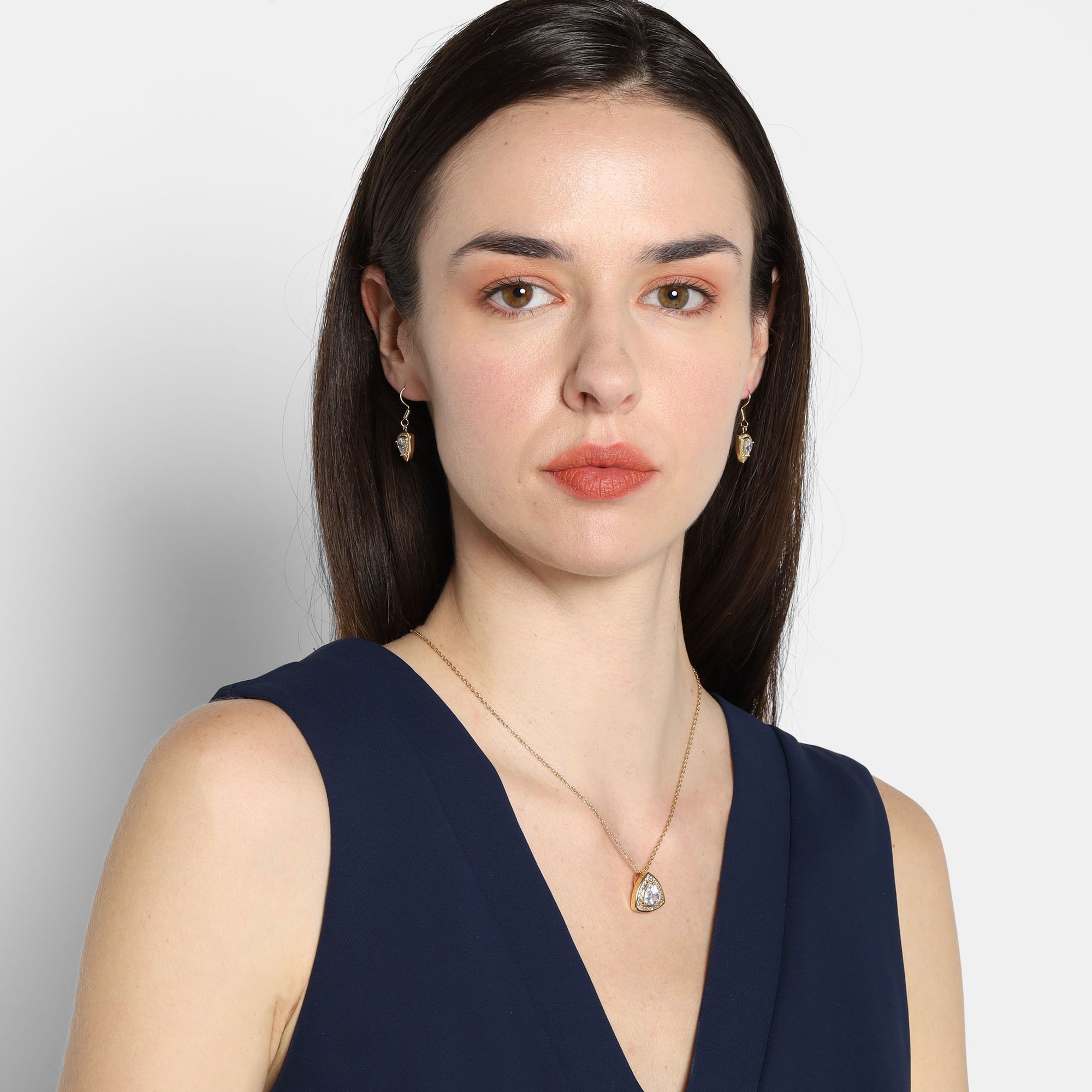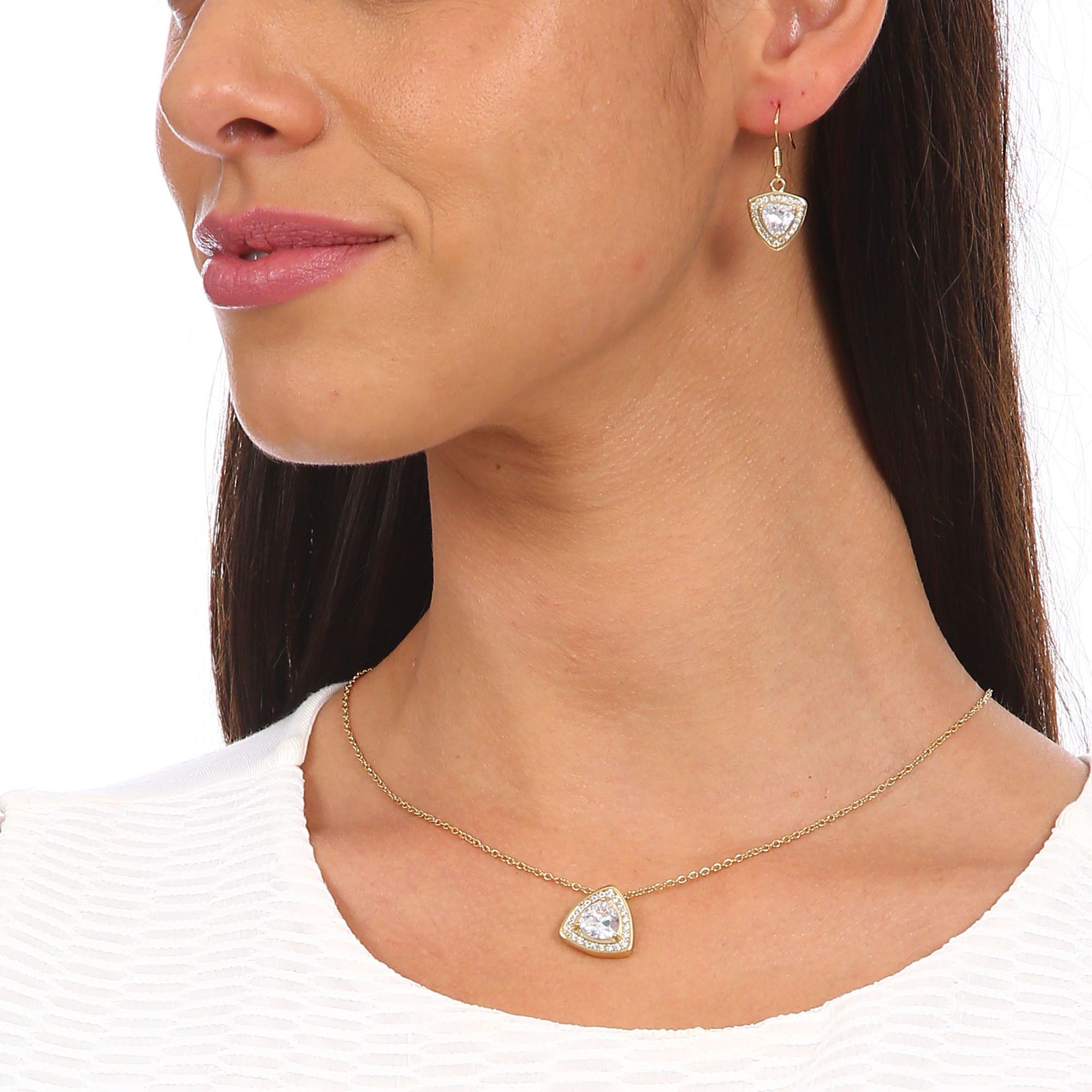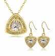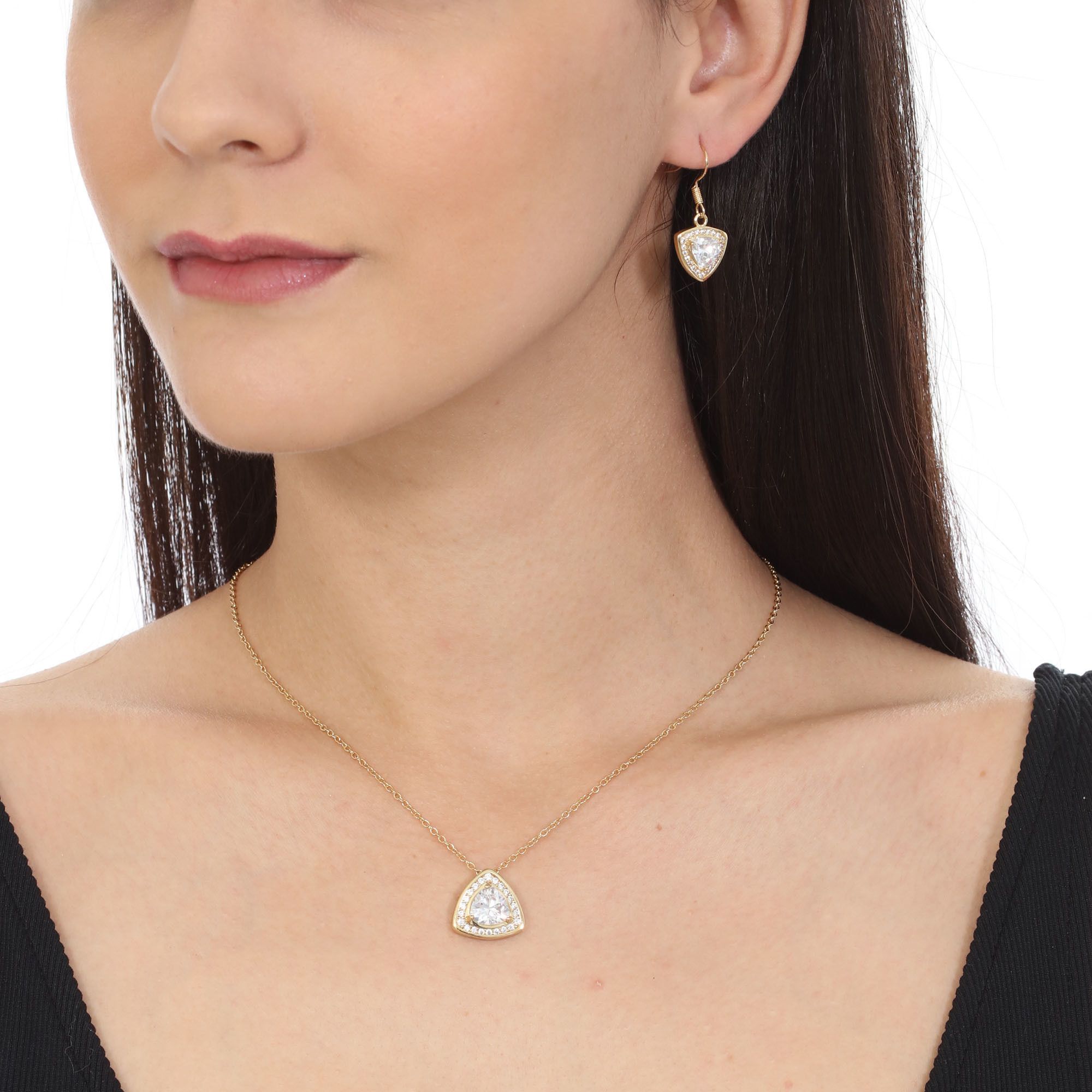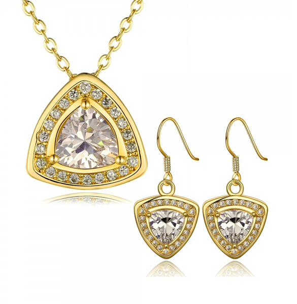 Hermoso juego de aretes y dije con cadena en ba�o de oro amarillo de 18 quilates , dise�o de tri�ngulo con cristales blancos corte trillion e incrustaciones de cristales en color blanco. Fabricado en una estructura de aleaci�n de platino con rodio sin n�quel.