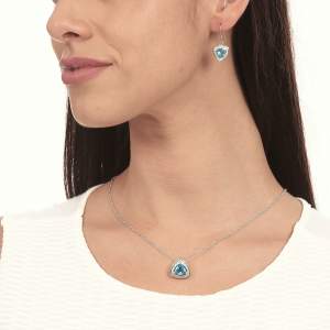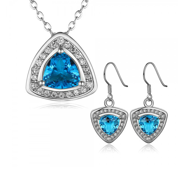 Hermoso juego de aretes y dije en baño de oro blanco de 18 quilates , diseño de triángulo con cristales azules corte trillion e incrustaciones de cristales en color blanco. Fabricado en una estructura de aleación de platino con rodio sin níquel.