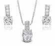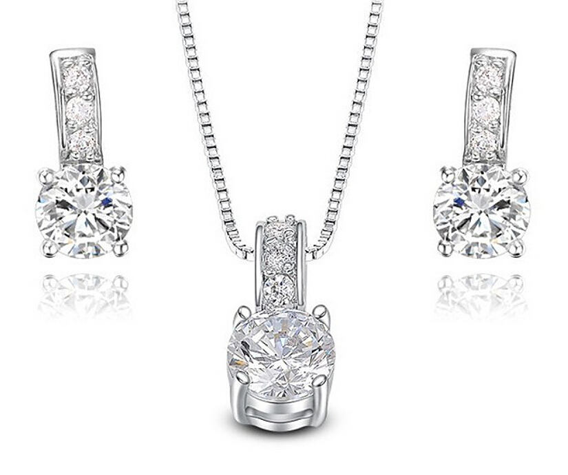 Juego de aretes y dije con cadena en baño de oro blanco de 18 quilates , fino diseño con cristales corte brillante e incrustaciones de cristales en color blanco. Fabricado en una estructura de aleación de platino con rodio sin níquel.