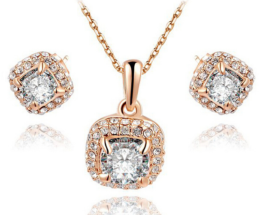 Hermoso juego de aretes y dije en baño de oro rosa de 18 quilates , diseño de cuadro con critales blancos corte brillante e incrustaciones de cristales en color blanco. Fabricado en una estructura de aleación de platino con rodio sin níquel.