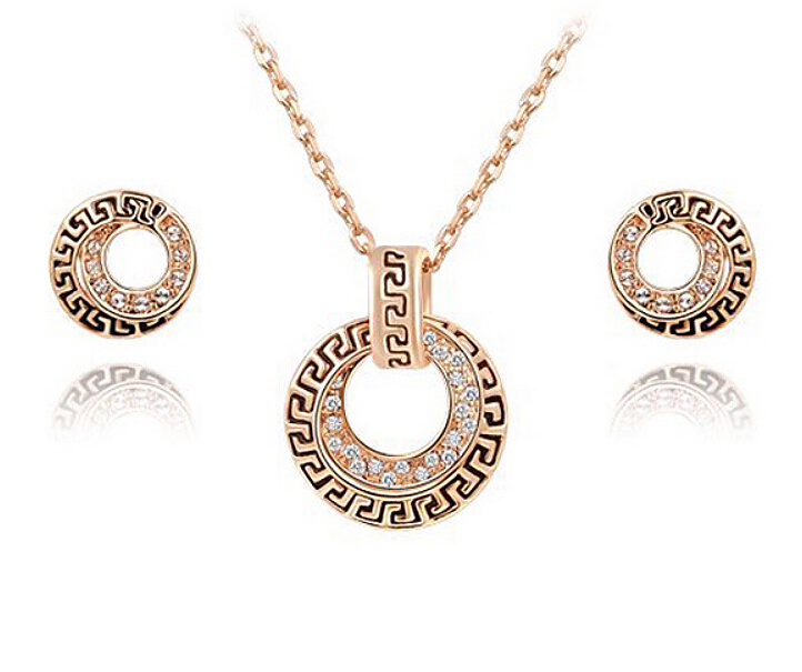 Hermoso juego de aretes y dije con cadena en baño de oro rosa de 18 quilates, con diseño de aros con grecas grbadas e incrustaciones de cristales en color blanco. Fabricado en una estructura de aleación de platino con rodio sin níquel.
