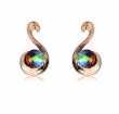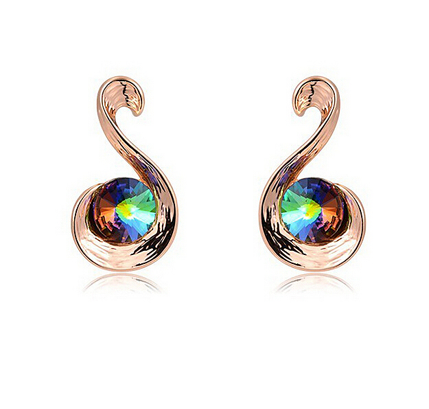 Finos aretes en baño de oro rosa de 18 quilates, diseño de "Clave de Sol", con cristal en color tornasol. Fabricado en una estructura de aleación de platino con rodio sin níquel.