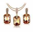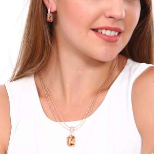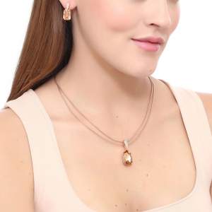 Hermoso juego de dije con cadena semirígida en baño de oro rosa de 18 quilates, fino diseño con detalles dorados, cristales ámbar corte radiante e incrustaciones de cristales en color ámbar. Fabricado en una estructura de aleación de platino con rodio sin níquel.