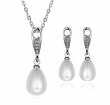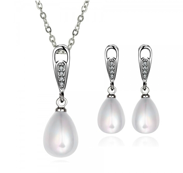 Hermoso juego de aretes y dije con cadena en baño de oro blanco de 18 quilates , fino diseño con detalles plateados, gotas de perla blanca e incrustaciones de cristales en color blanco. Fabricado en una estructura de aleación de platino con rodio sin níquel.