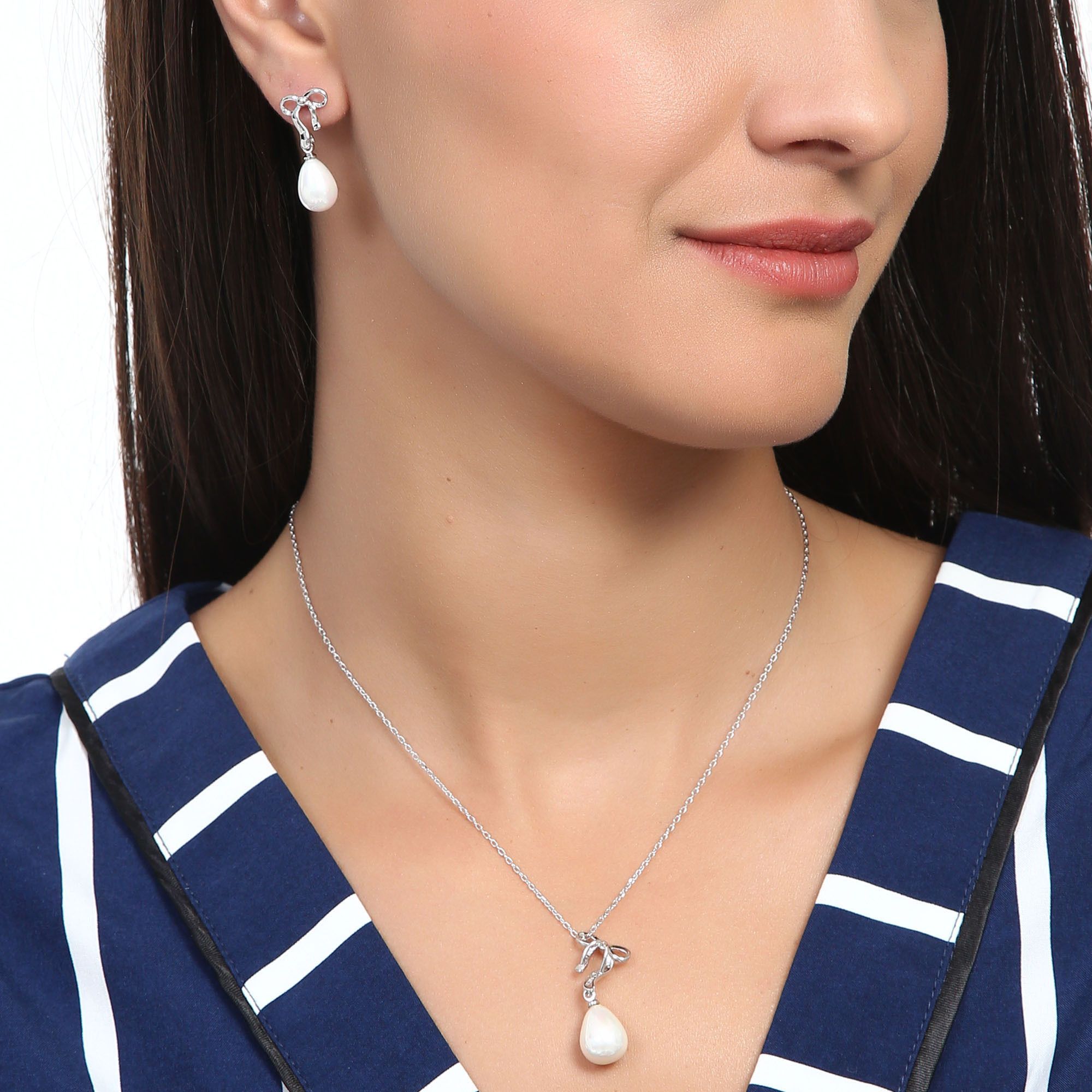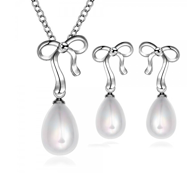 Juego de aretes y dije con cadena en baño de oro blanco de 18 quilates, diseño de moño plateado con gotas de perla blanca de cristal. Fabricado en una estructura de aleación de platino con rodio sin níquel.