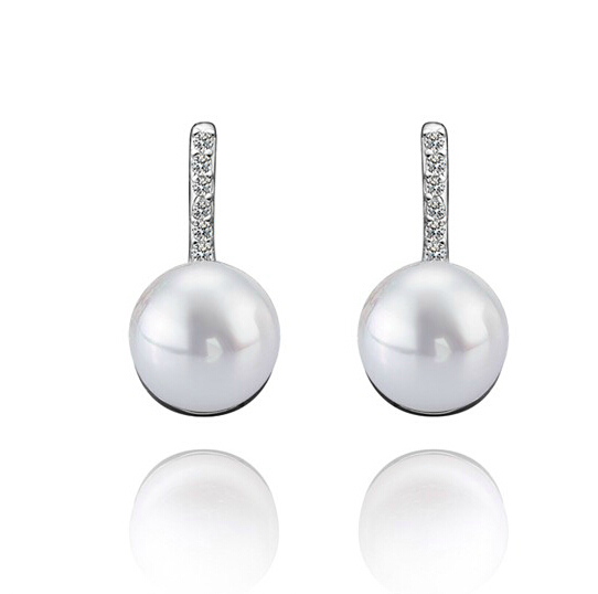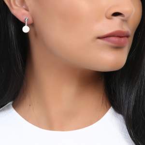 Aretes en baño de oro blanco, fino diseño con incrustaciones de cristales en color blanco y detalle de perla blanca. Fabricado en una estructura de aleación de platino con rodio sin níquel.