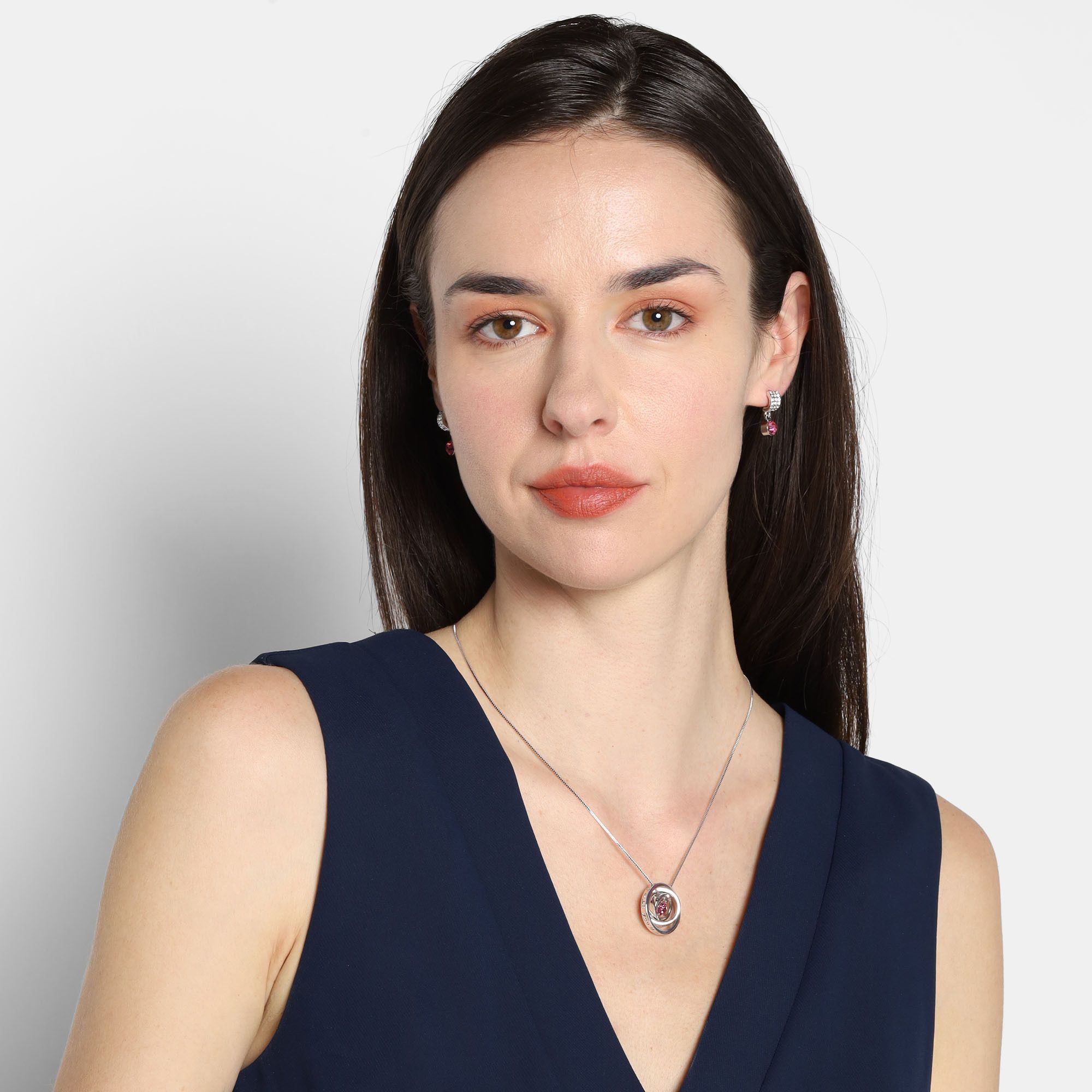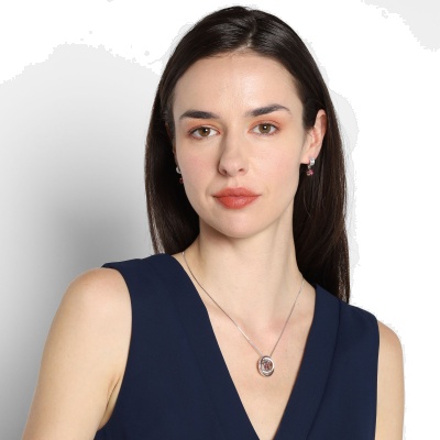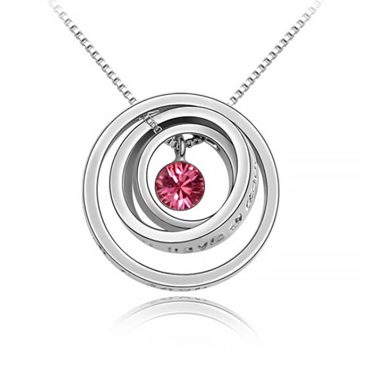 Dije con cadena en ba�o de oro blanco de 18 quilates, dise�o de aros con relieve e incrustaci�n de cristal color rosa. Fabricado en una estructura de aleaci�n de platino con rodio sin n�quel.