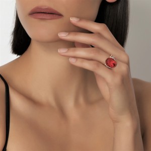 Anillo en baño de oro amarillo de 18 quilates, fino diseño con cristal rojo corte oval e incrustaciones de cristales blancos. Fabricado en una estructura de aleación de platino con rodio sin níquel.