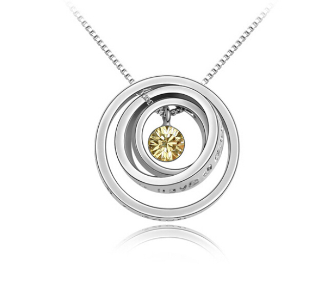 Dije con cadena en baño de oro blanco de 18 quilates, diseño de aros con relieve e incrustación de cristal en color ámbar. Fabricado en una estructura de aleación de platino con rodio sin níquel.