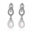 Elegantes aretes en baño de oro blanco de 18 quilates, con detalles de perla blanca con incrustaciones de cristales en color blanco. Fabricado en una estructura de aleación de platino con rodio sin níquel.