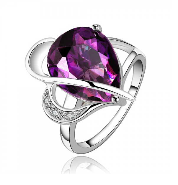 Elegante anillo en baño de oro blanco de 18 quilates, diseño de corazón estilizado, con cristal violeta corte pera e incrustaciones de cristales blancos. Fabricado en una estructura de aleación de platino con rodio sin níquel.