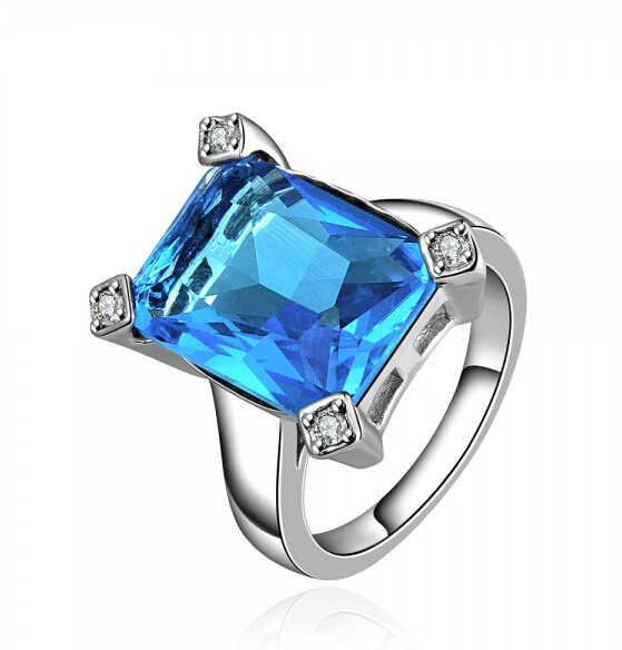 Elegante anillo, en baño de oro blanco de 18 quilates, con cristal azul caribe, corte baguette e incrustaciones de cristales blancos. Fabricado en una estructura de aleación de platino con rodio sin níquel.