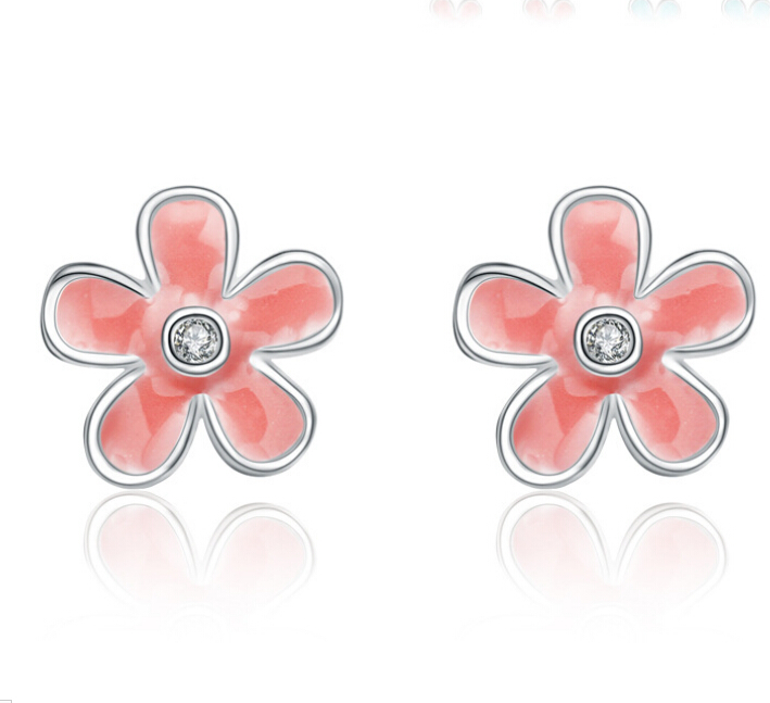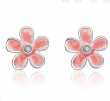Finos y lindos aretes en baño de oro blanco de 18 quilates, diseño de lindas florecitas en tono rosa, con incrustación de cristales. Fabricado en una estructura de aleación de platino con rodio sin níquel.