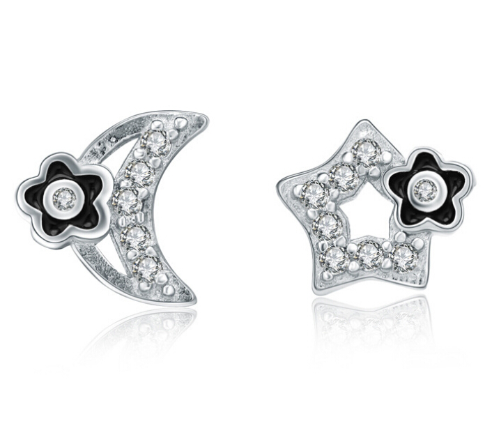 Lindos aretes en baño de oro blanco de 18 quilates, diseño de estrella y luna con esmaltado blanco y negro e incrustaciones de cristales blancos. Fabricado en una estructura de aleación de platino con rodio sin níquel.