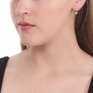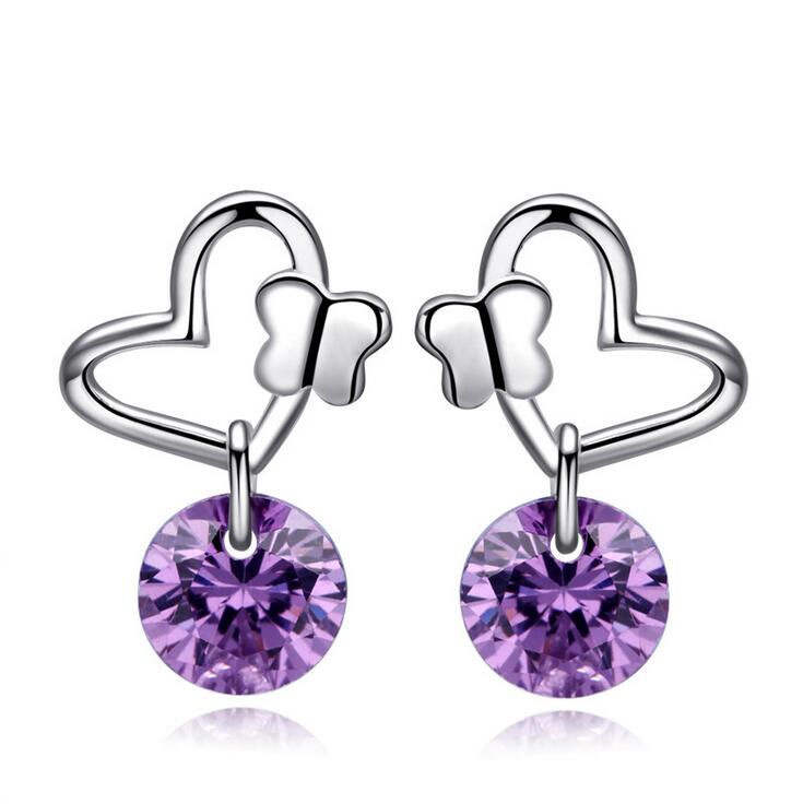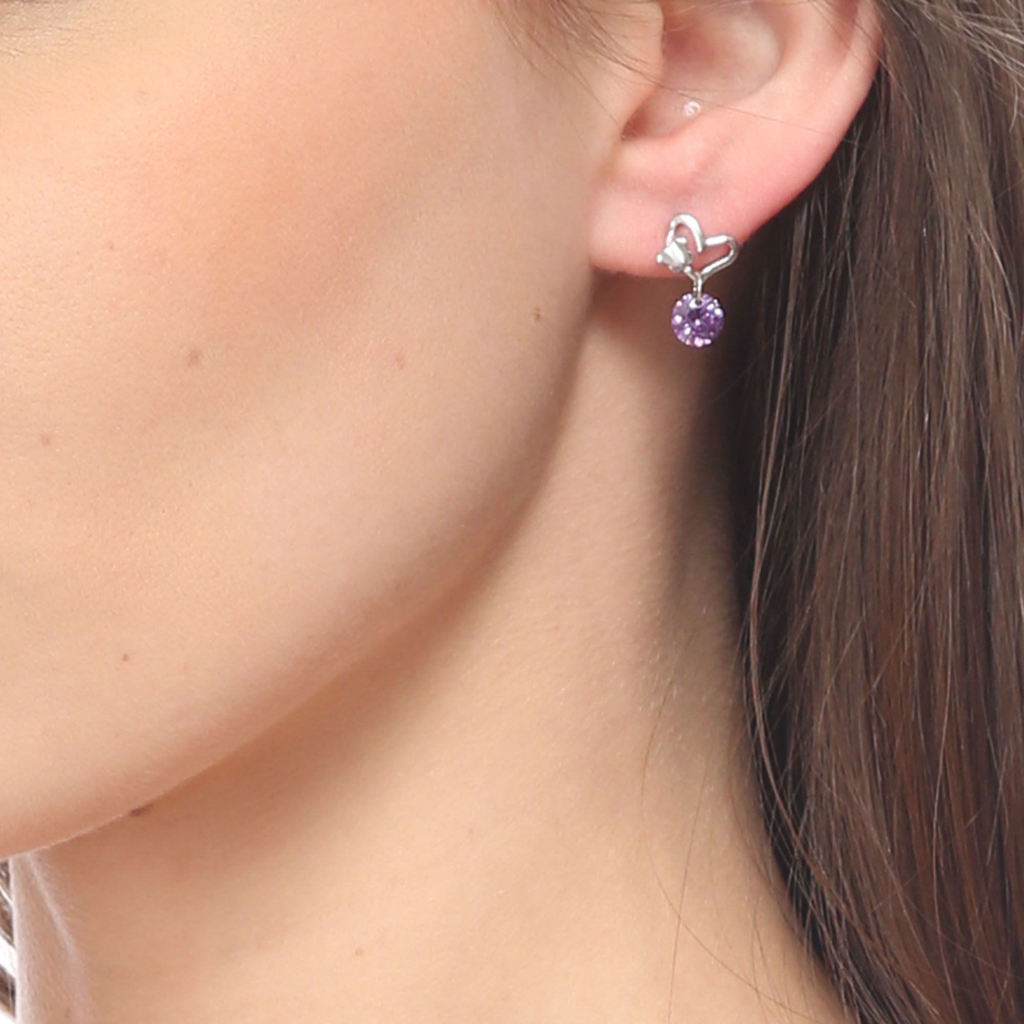 Finos y lindos aretes en baño de oro blanco de 18 quilates, diseño de corazón con incrustaciones de cristales en color morado. Fabricado en una estructura de aleación de platino con rodio sin níquel.