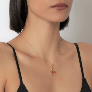 Dije con cadena en baño de oro amarillo de 18 quilates, diseño de cisne con incrustaciones de cristales en color rojo y blanco. Fabricado en una estructura de aleación de platino con rodio sin níquel.