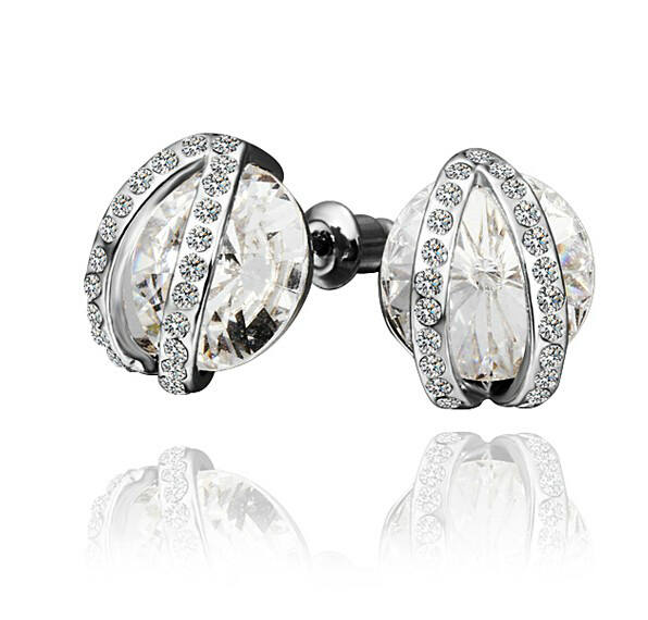 Aretes en baño de oro blanco de 18 quilates, diseño de circulo con incrustaciones de cristales en color blanco. Fabricado en una estructura de aleación de platino con rodio sin níquel.