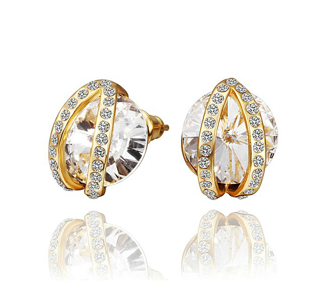 Aretes en baño de oro amarillo de 18 quilates, diseño de circulo con incrustaciones de cristales en color blanco. Fabricado en una estructura de aleación de platino con rodio sin níquel.