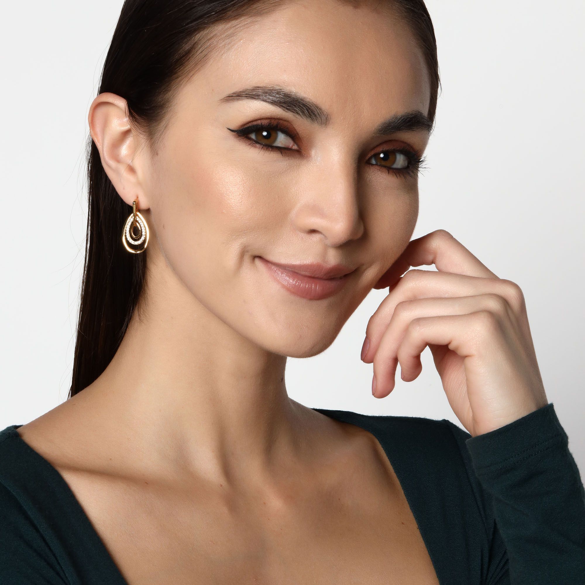 Aretes en baño de oro amarillo de 18 quilates, diseño de ovoide con incrustaciones de cristales en color blanco. Fabricado en una estructura de aleación de platino con rodio sin níquel.