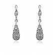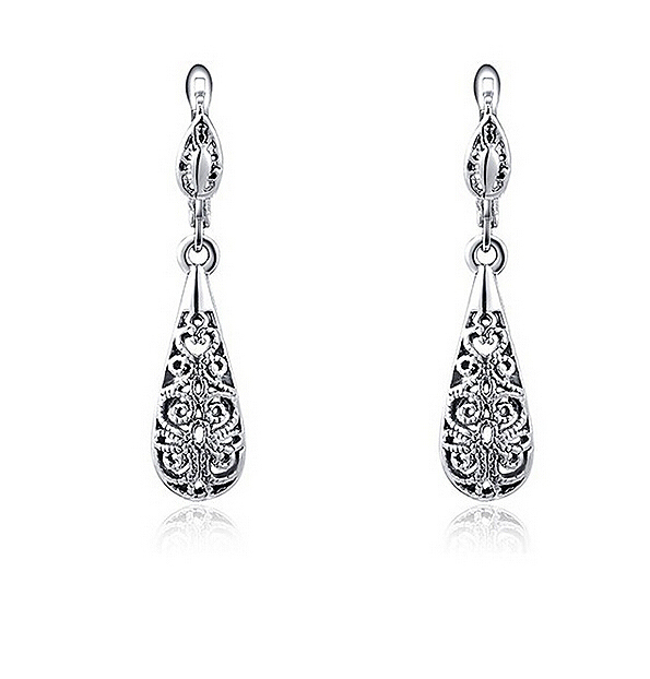 Preciosos aretes en baño de oro blanco de 18 quilates, diseño de gota con detalles calados y en relieve.