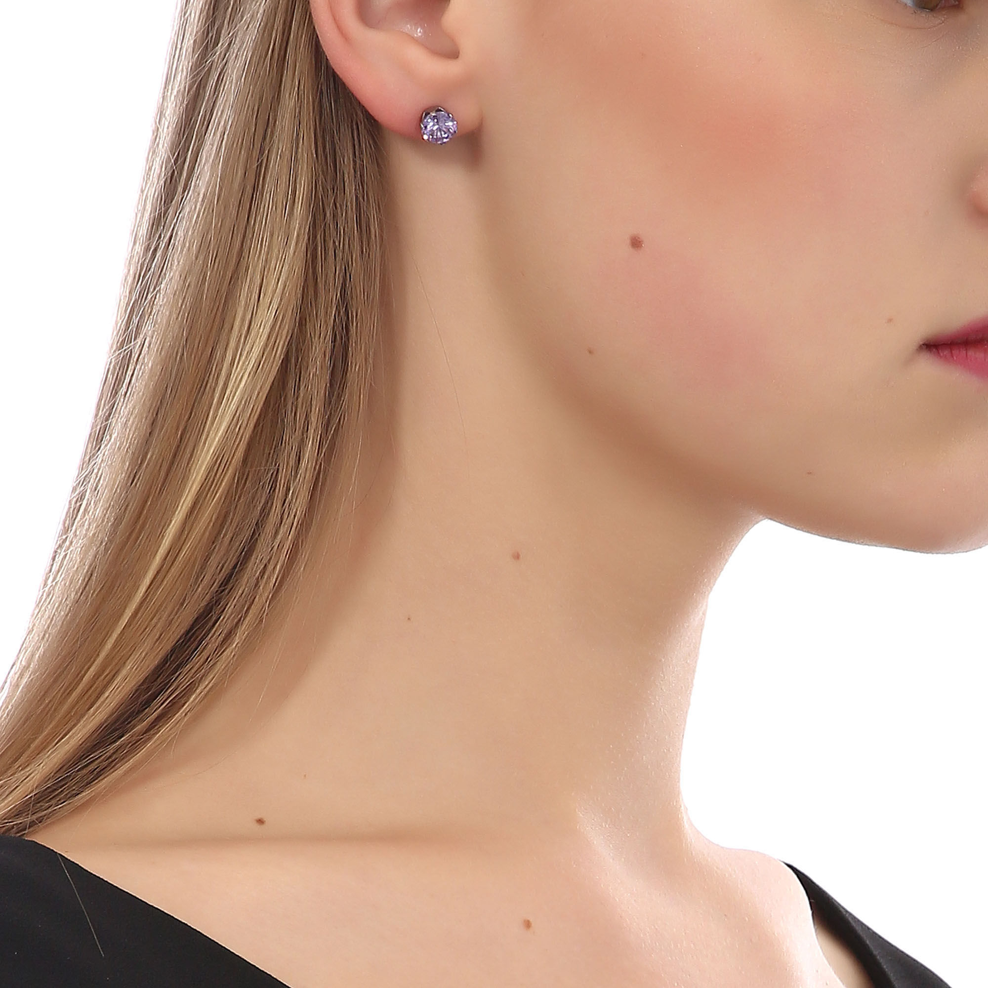 Hermosos y finos aretes de acero inoxidable, diseño con incrustación de cristal en color morado. Fabricado en una estructura de aleación de platino con rodio sin níquel.