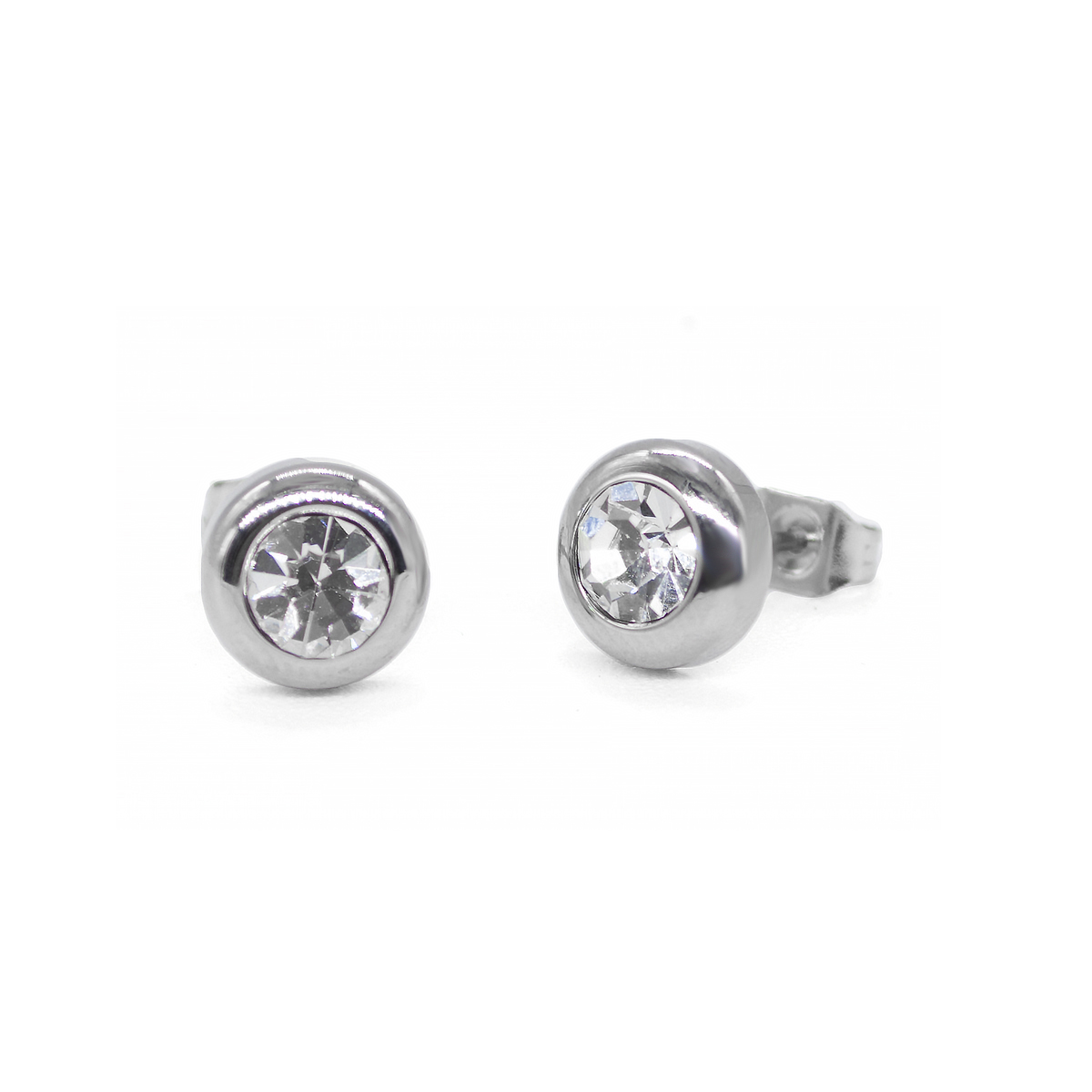 Aretes en baño de oro blanco de 18 quilates, diseño de circulo con incrustació de cristal en color blanco. Fabricado en una estructura de aleación de platino con rodio sin níquel.