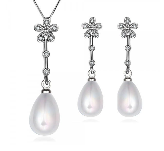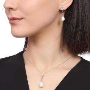 Juego de aretes y dije con cadena en baño de oro blanco de 18 quilates, diseño de flores,con gota de perla blanca e incrustaciones de cristales en color blanco.