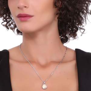 Dije con cadena en baño de oro blanco de 18 quilates, fino diseño de concha abanico en cristal ámbar. Fabricado en una estructura de aleación de platino con rodio sin níquel.