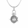 Llamador en baño de oro blanco de 18 quilates, fino diseño estilo filigrana, perla blanca de cristal sin sonido, grabado con palabra "LUCKY" y broche de presión fijo.