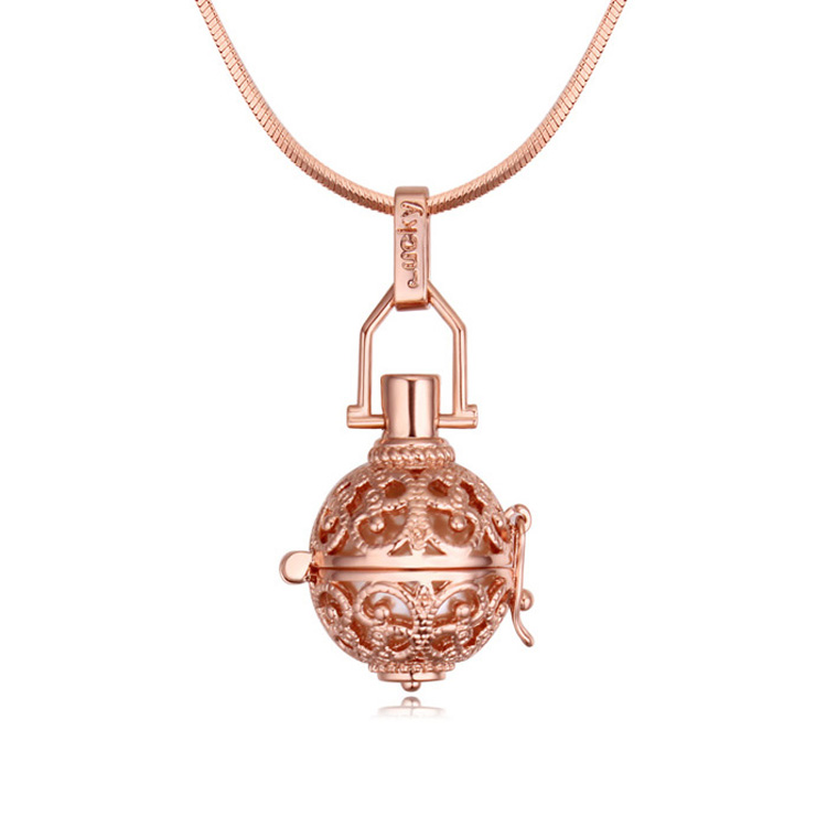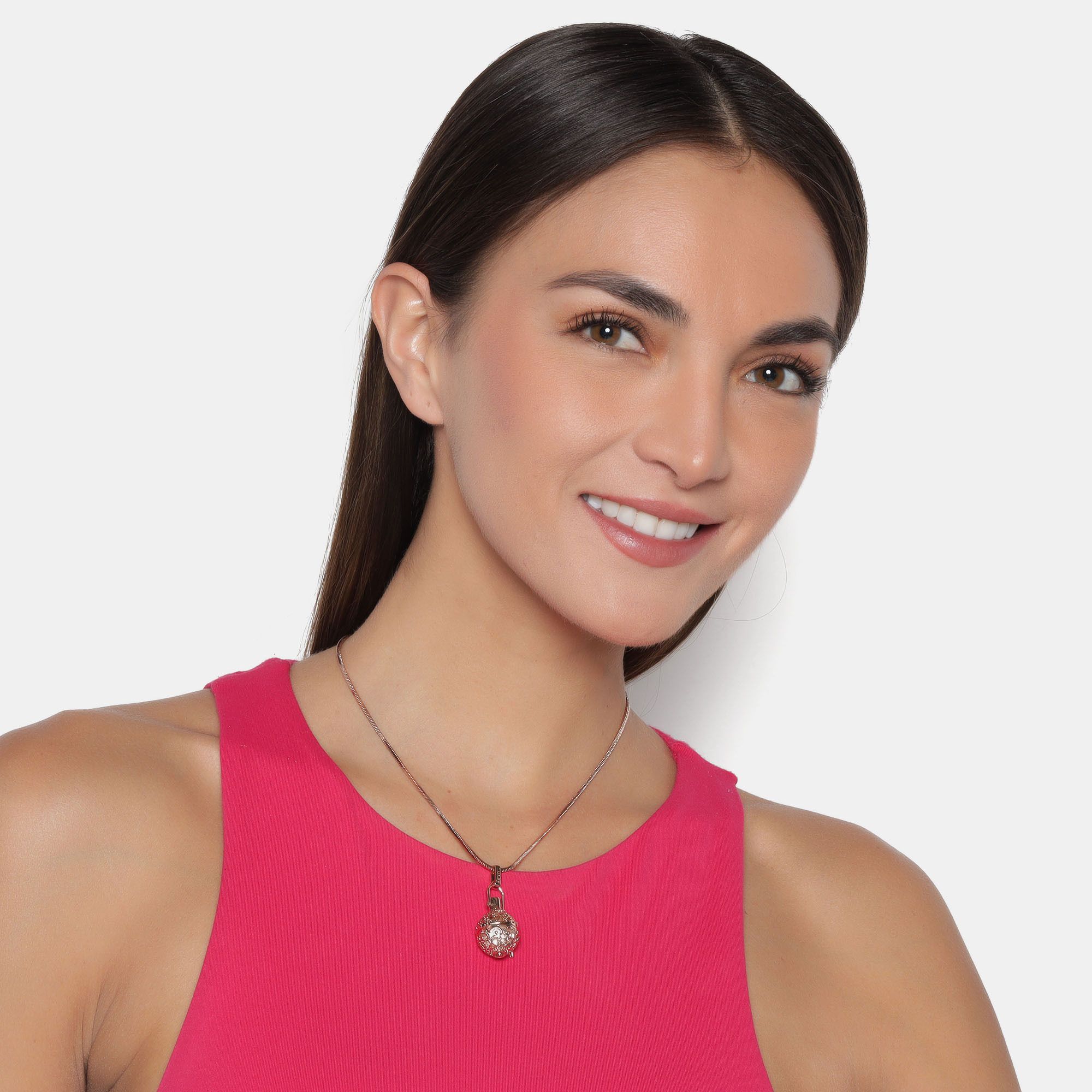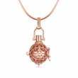 Llamador en baño de oro rosa de 18 quilates, fino diseño estilo filigrana, perla blanca de cristal sin sonido, grabado con palabra "LUCKY" y broche de presión fijo.