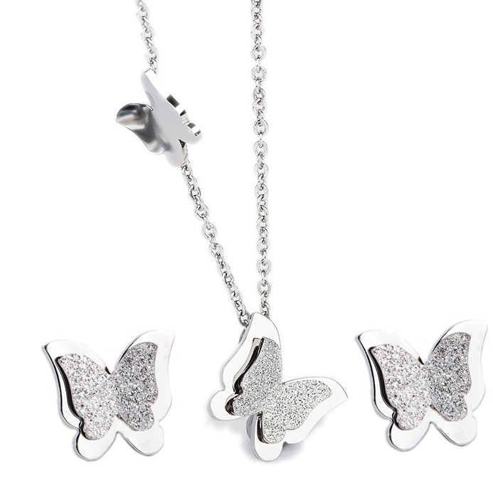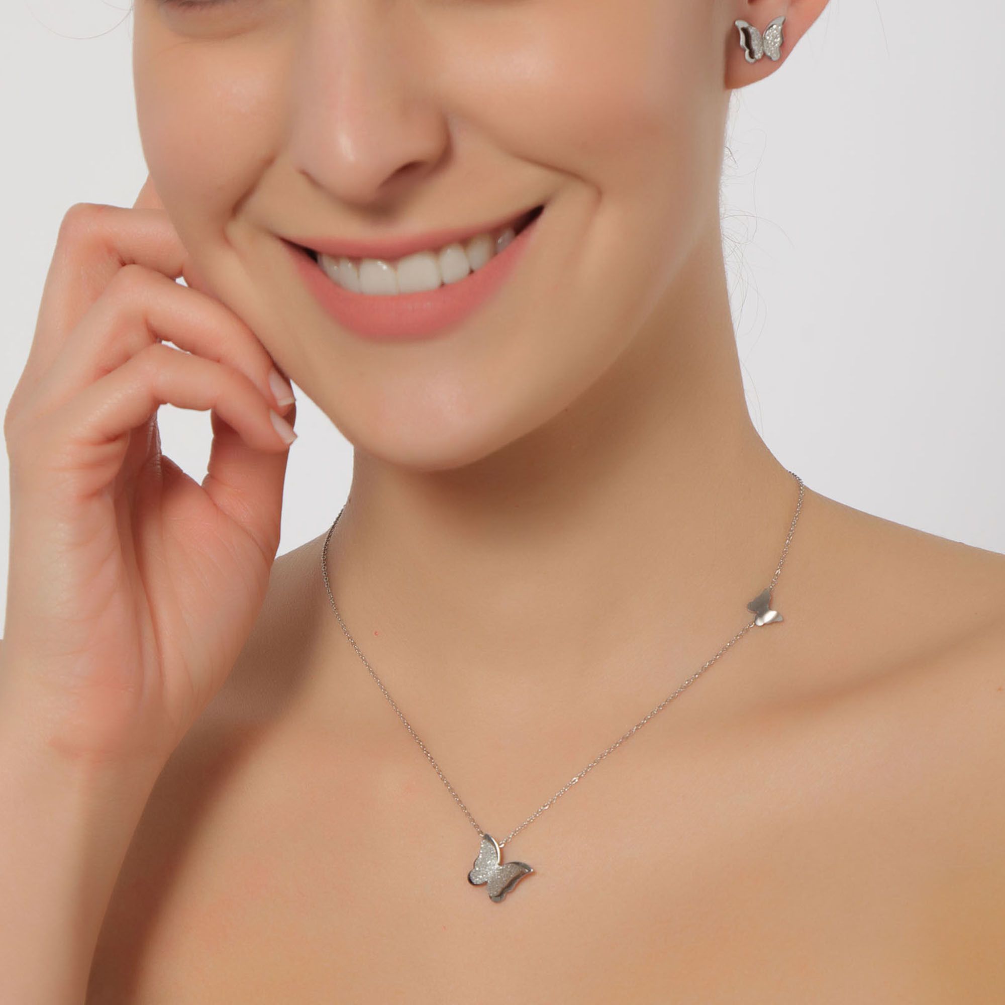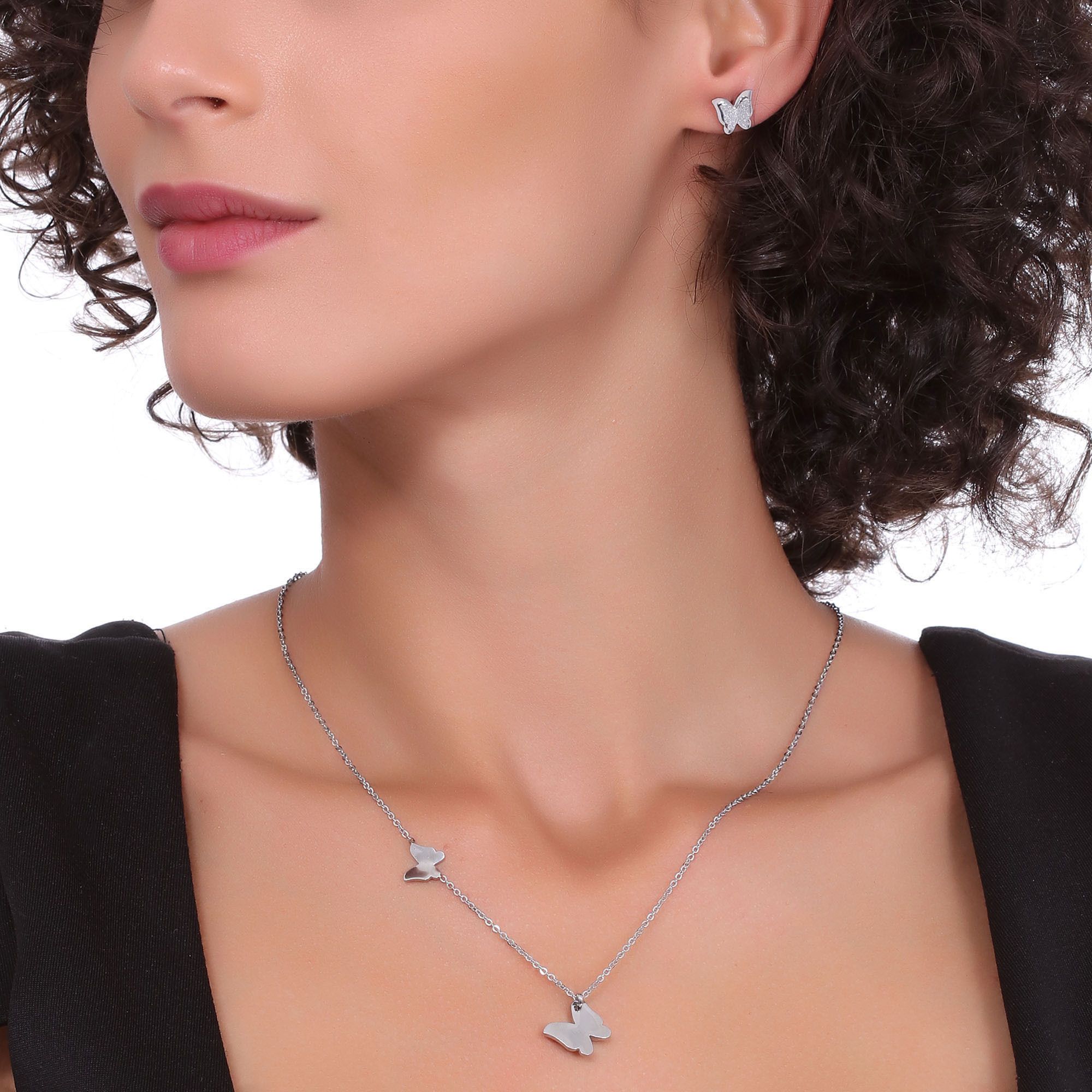Juego de dije con cadena y aretes en acero inoxidable color blanco, diseño de mariposas en relieve con chispas de cristales blancos.