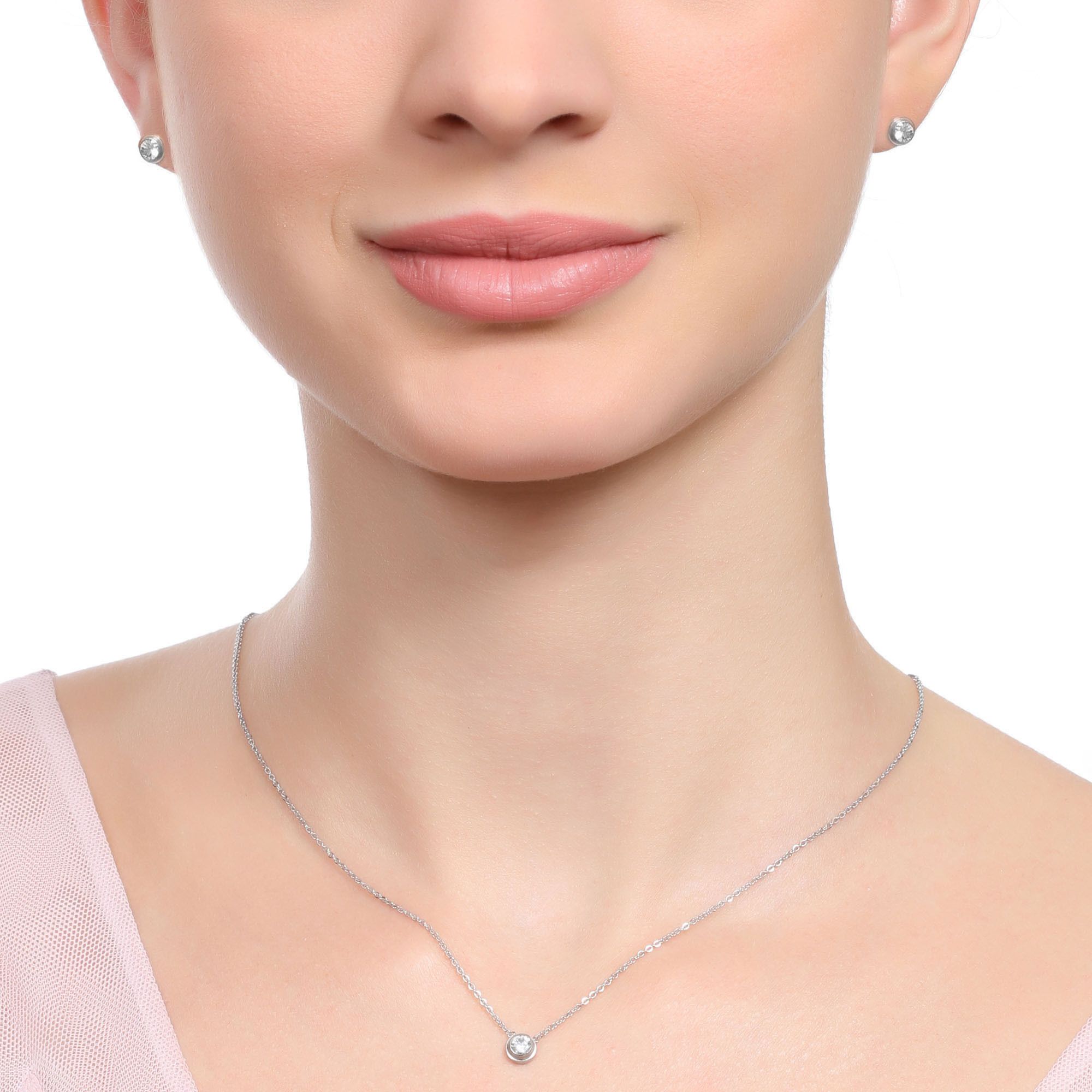 Juego de collar con aretes en acero inoxidable color blanco, fino diseño con cristal blanco corte brillante.