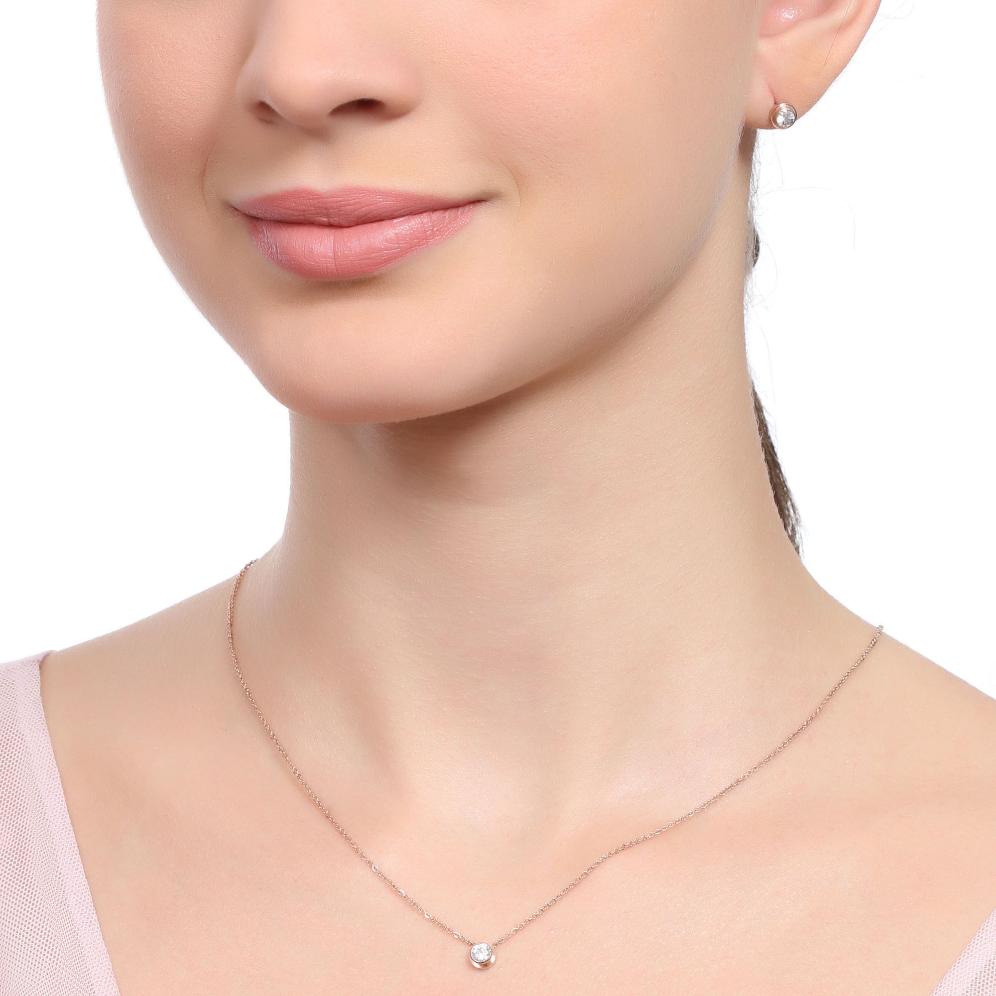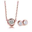 Juego de aretes y collar en acero inoxidable tono rosa, delicado diseño de círculo con incrustaciones de cristales blancos corte brillante.