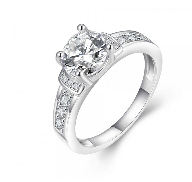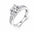 Elegante anillo, en baño de oro blanco de 18 quilates, con cristal blanco corte brillante e incrustaciones de cristales color blanco. Fabricado en una estructura de aleación de platino con rodio sin níquel.