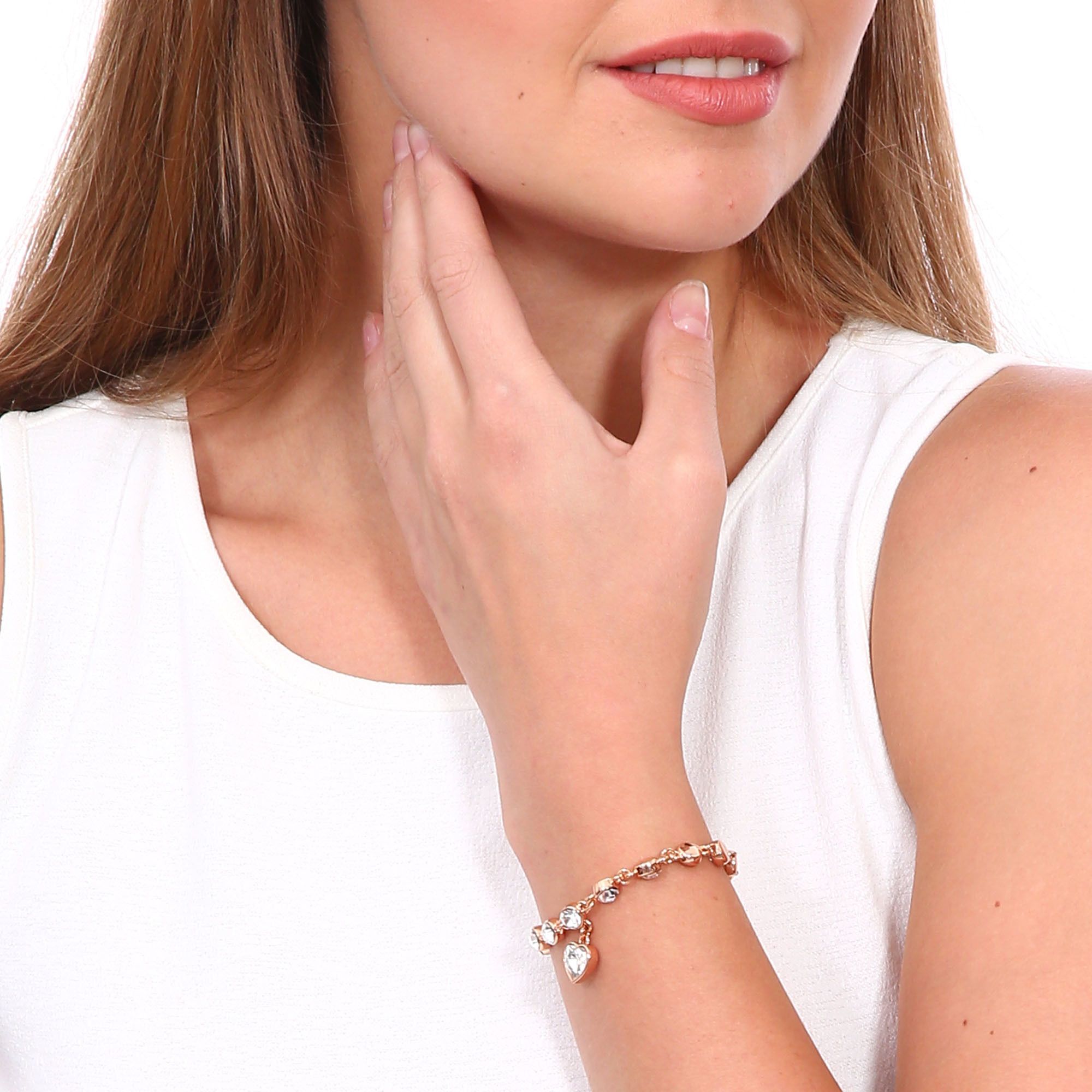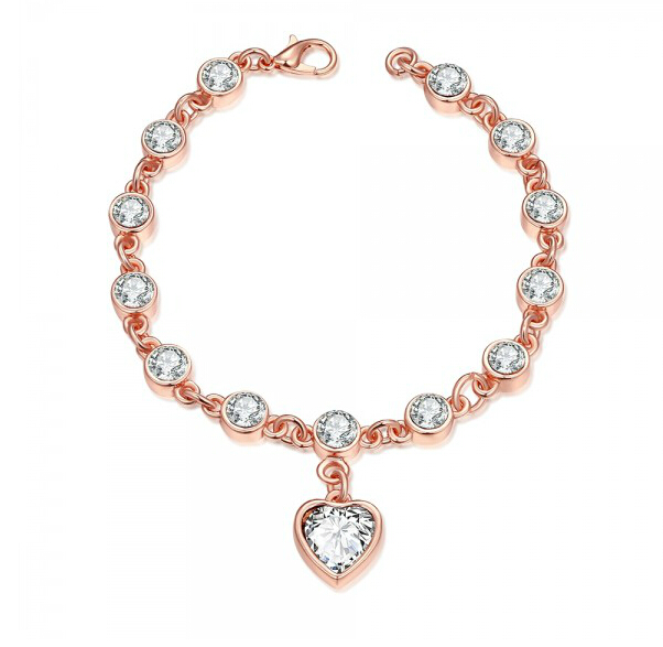 Hermoso brazalete en baño de oro rosa de 18 quilates, con dije de corazón e incrustaciones de cristales en color blanco. Fabricado en una estructura de aleación de platino con rodio sin níquel.