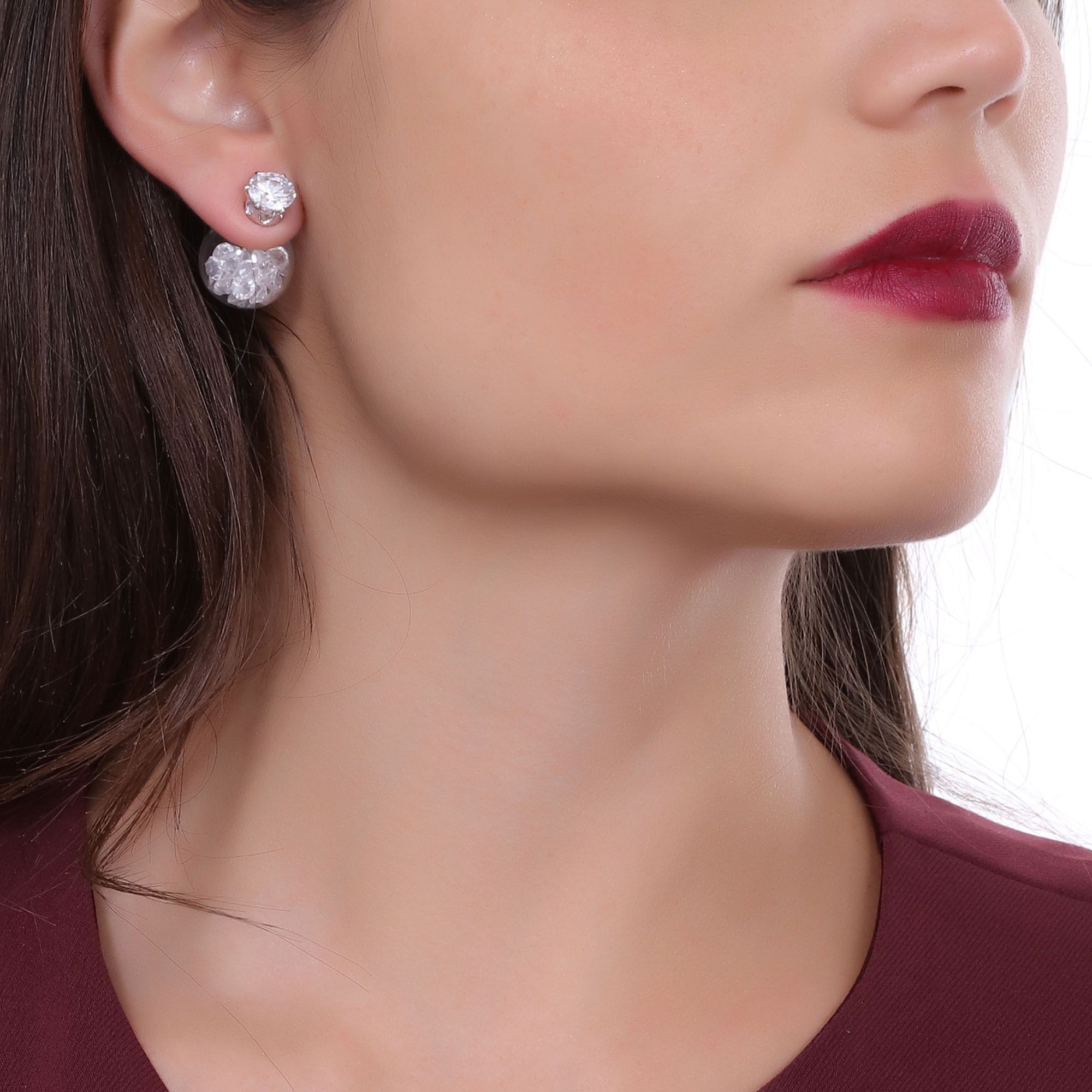 Lindos aretes con baño de oro blanco de 18 quilates, detalle de esfera de cristal blanco e incrustaciones de cristales color blanco. Fabricado en una estructura de aleación de platino con rodio sin níquel.