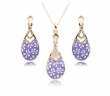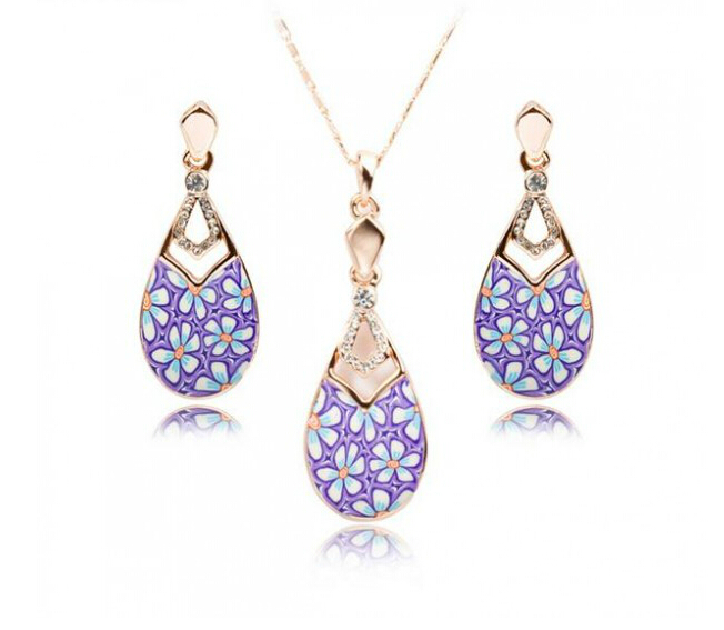 Hermoso juego de dije con aretes en baño de oro blanco de 18 quilates , diseño de gotas con diseño de flores en fondo lila e incrustaciones de cristales color blanco. Fabricado en una estructura de aleación de platino con rodio sin níquel.