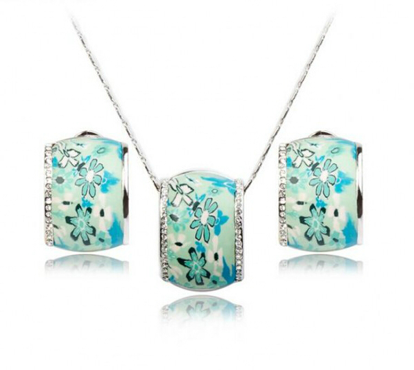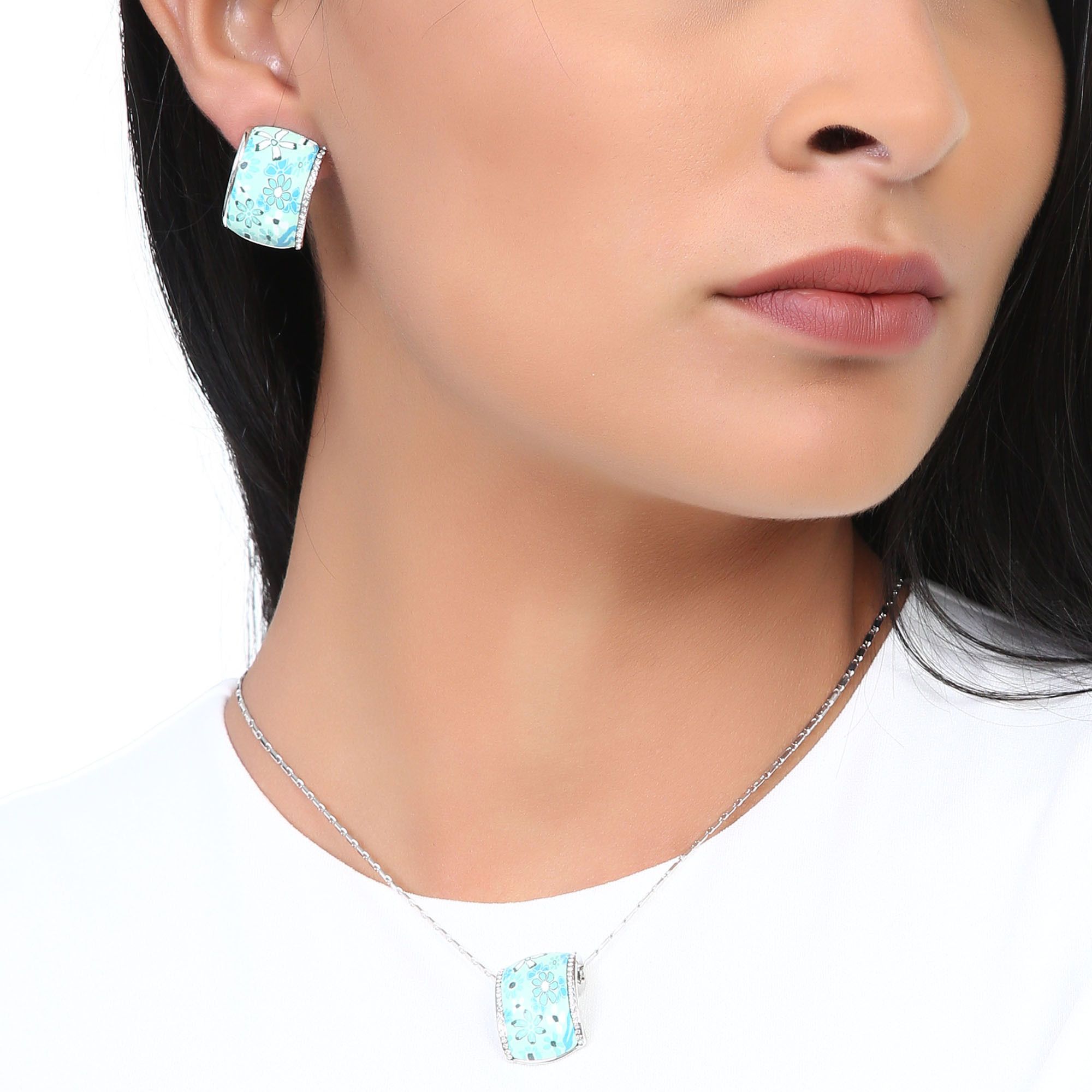 Hermoso juego de dije con cadena y aretes en baño de oro blanco de 18 quilates , diseño de cilindros con flores en tonos verdes e incrustaciones de cristales en color blanco. Fabricado en una estructura de aleación de platino con rodio sin níquel.