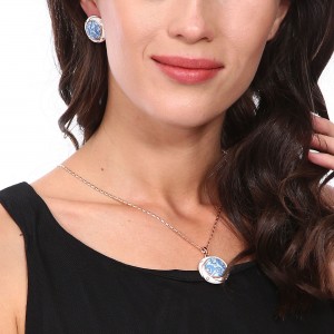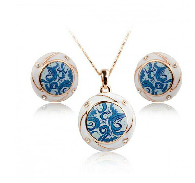 Juego de dije con cadena y aretes en baño de oro rosa de 18 quilates , diseño de esferas con espirales tonos azules e incrustaciones de cristales en color blanco. Fabricado en una estructura de aleación de platino con rodio sin níquel.