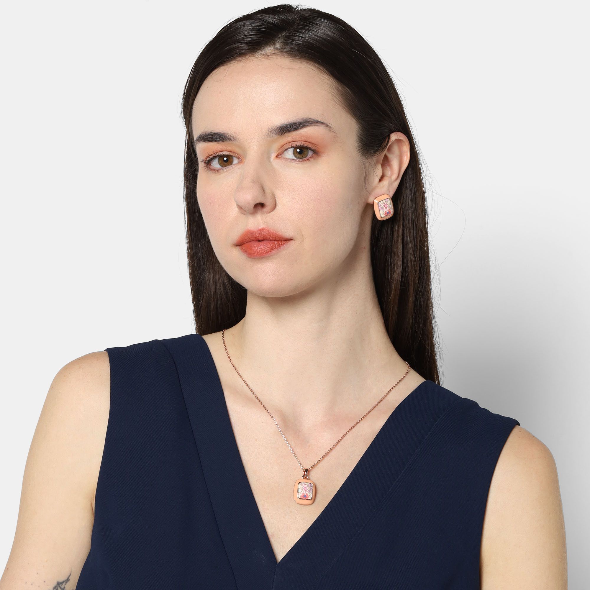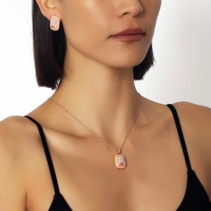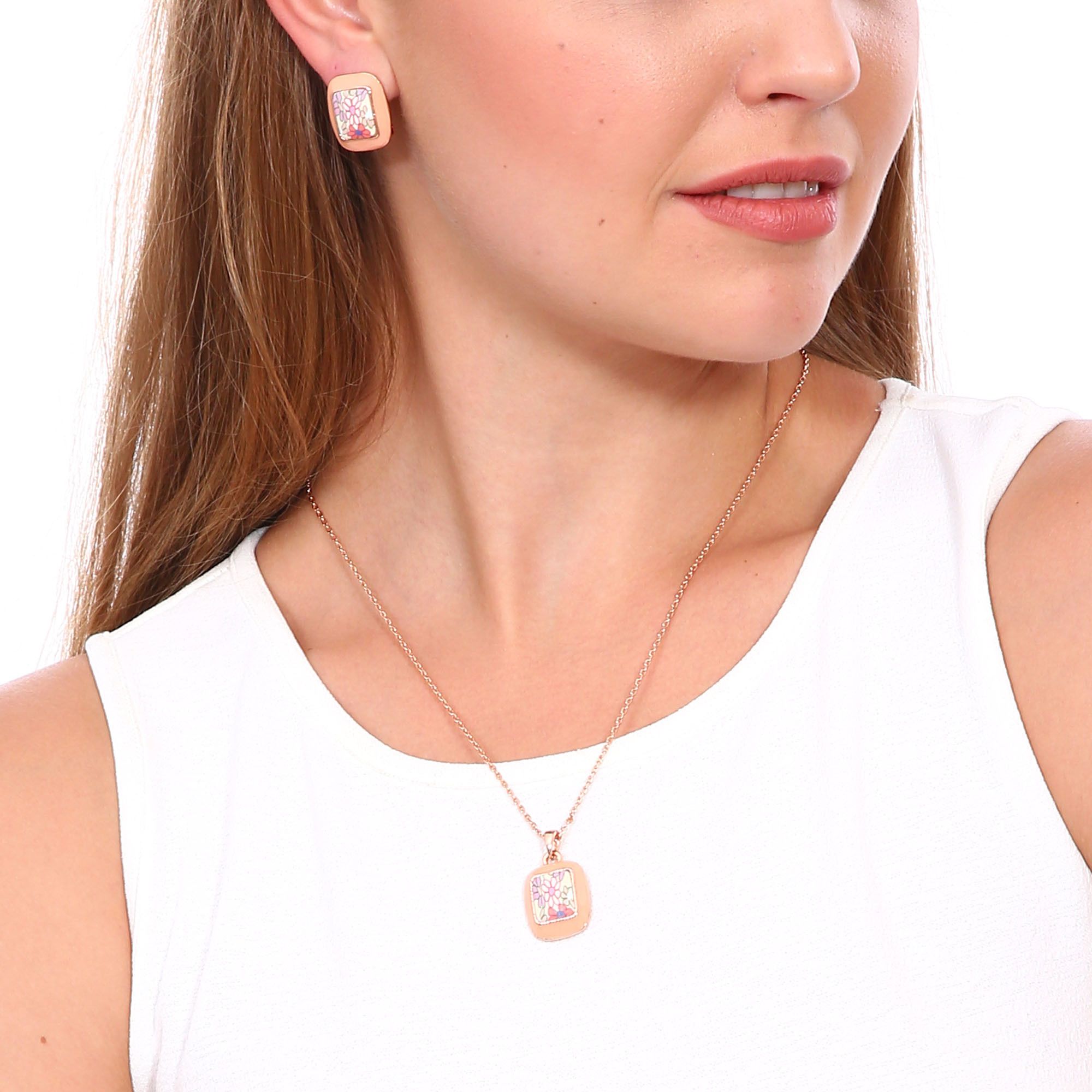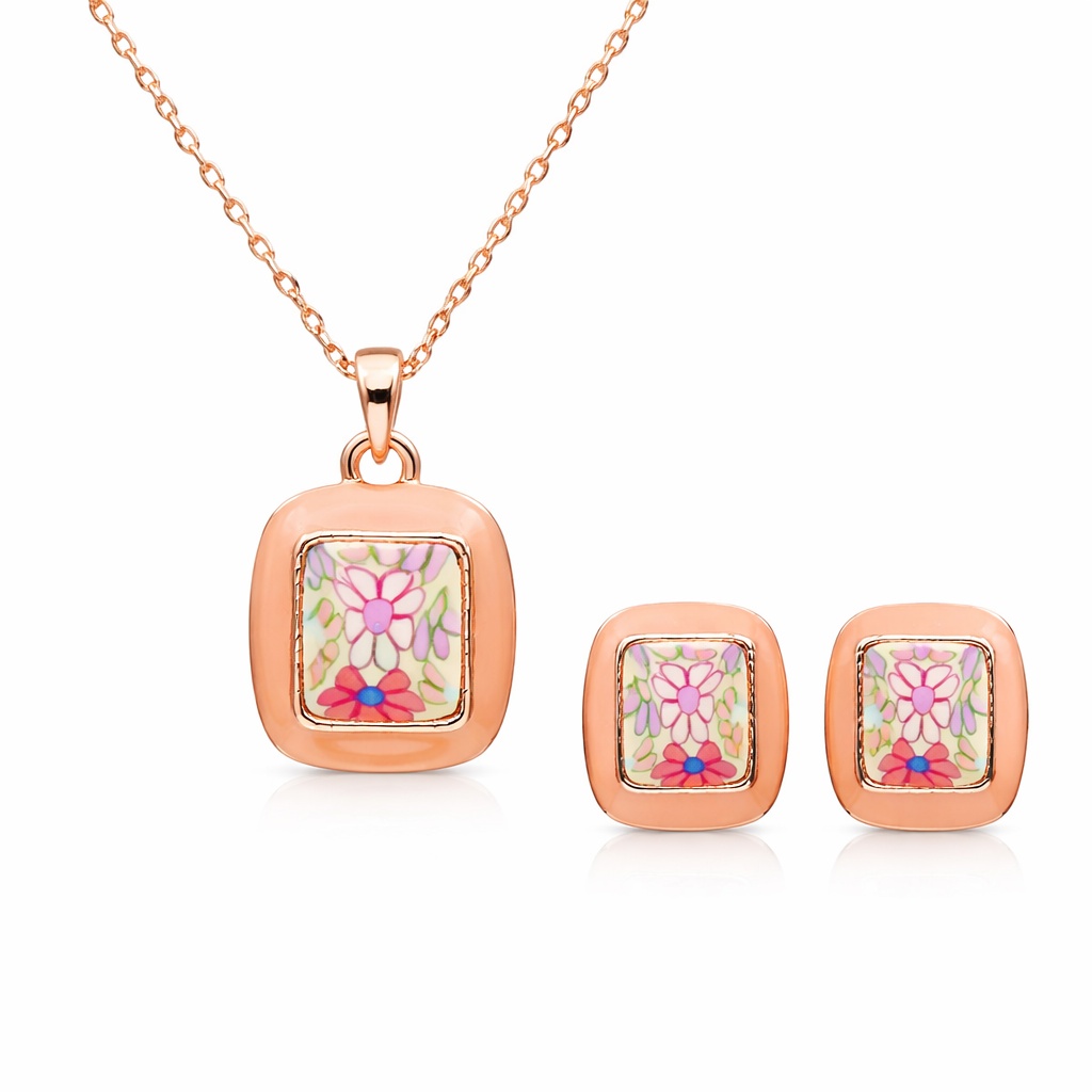 Juego de dije con cadena y aretes en baño de oro rosa de 18 quilates, diseño de rectángulo con flores en tonos rosas, sobre fondo color durazno. Fabricado en una estructura de aleación de platino con rodio sin níquel.