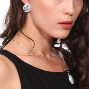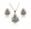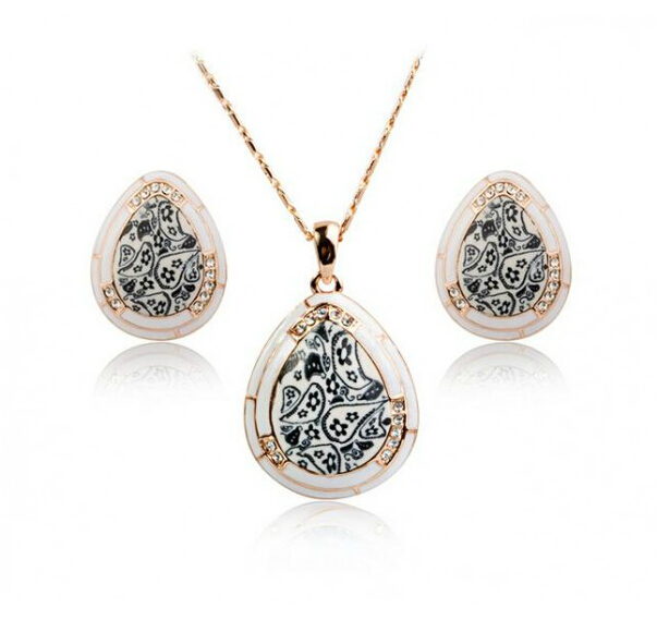 Hermoso juego de aretes y dije con cadena en baño de oro amarillo de 18 quilates , diseño de gota estilo talavera con incrustaciones de cristales en color blanco. Fabricado en una estructura de aleación de platino con rodio sin níquel.
