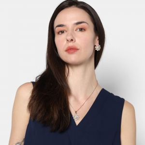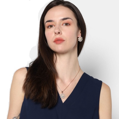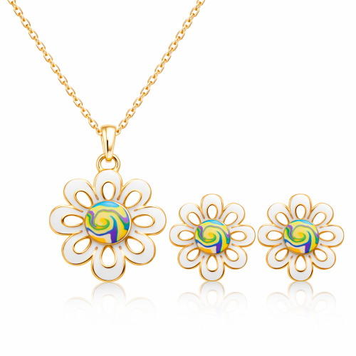 Hermoso juego de aretes y dije en baño de oro rosa de 18 quilates , diseño de flor con esmaltado blanco y centro de espiral multicolor e incrustaciones de cristales en color blanco. Fabricado en una estructura de aleación de platino con rodio sin níquel.