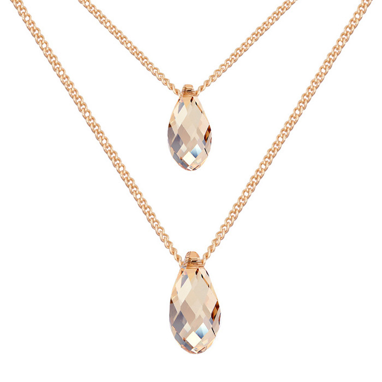 Precioso collar doble en baño de oro amarillo de 18 quilates, con gotas de cristal color ámbar. Fabricado en una estructura de aleación de platino con rodio sin níquel.