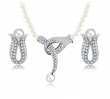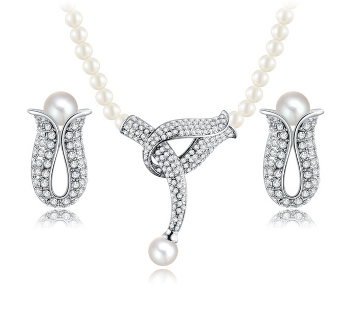 Hermoso juego de aretes y collar en baño de oro blanco de 18 quilates , diseño botón de flor, con perlas blancas e incrustaciones de cristales en color blanco. Fabricado en una estructura de aleación de platino con rodio sin níquel.