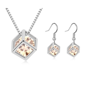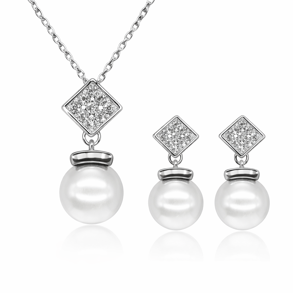 Juego de aretes y dije con cadena en baño de oro blanco de 18 quilates , diseño de rombo con perlas miel e incrustaciones de cristales color blanco. Fabricado en una estructura de aleación de platino con rodio sin níquel.