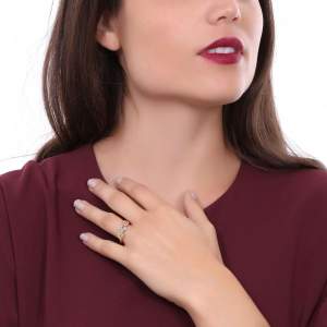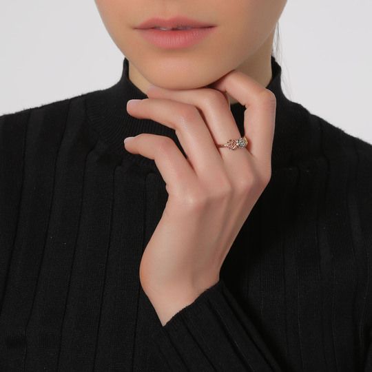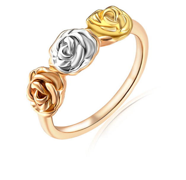 Elegante anillo en baño de oro amarillo, blanco y rosa de 18 quilates, bello diseño con rosas florentinas. Fabricado en una estructura de aleación de platino con rodio sin níquel.