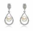 Hermosos aretes en baño de oro blanco de 18 quilates, diseño de gota con incrustaciones de cristales en color blanco y detalle de perla blanca. Fabricado en una estructura de aleación de platino con rodio sin níquel.
