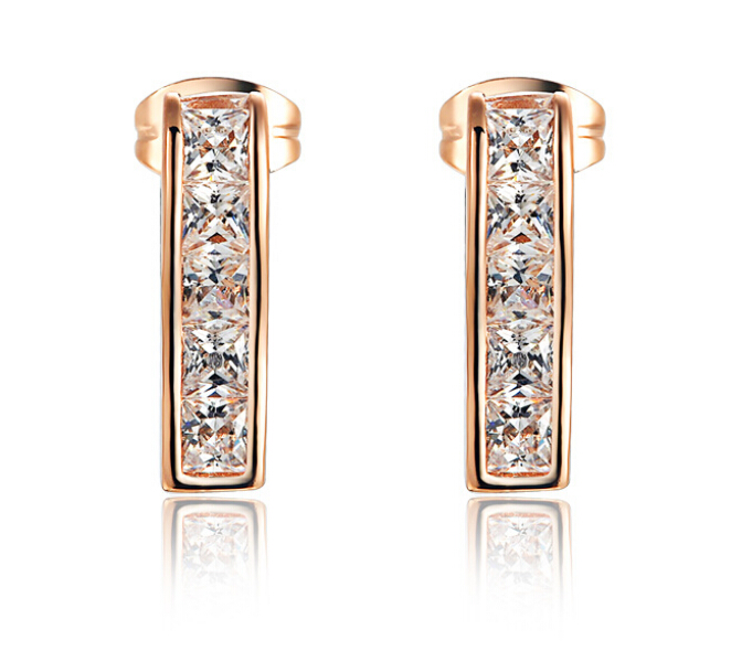 Hermosos aretes en baño de oro rosa de 18 quilates , diseño con incrustaciones de cristales blancos corte brillante. Fabricado en una estructura de aleación de platino con rodio sin níquel.