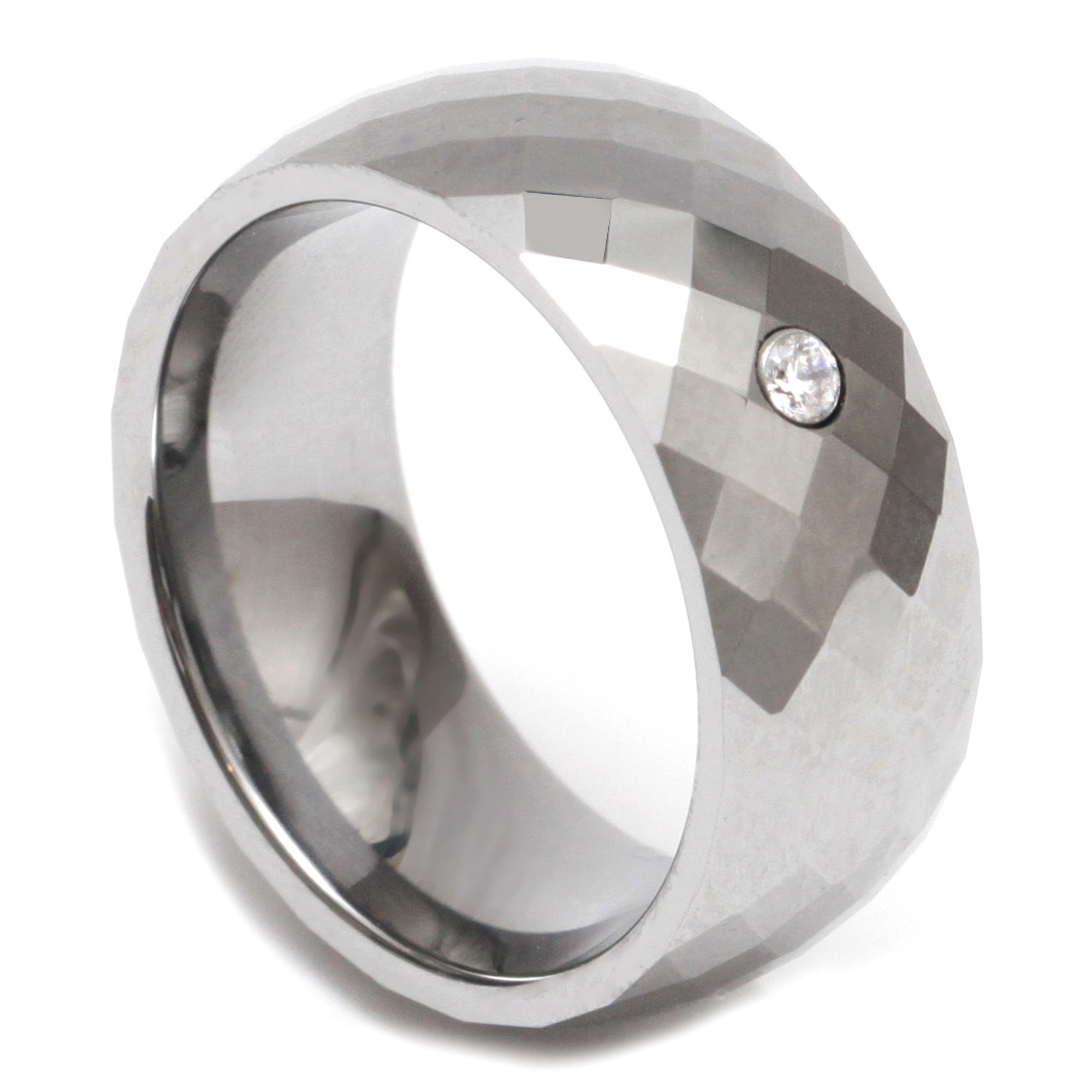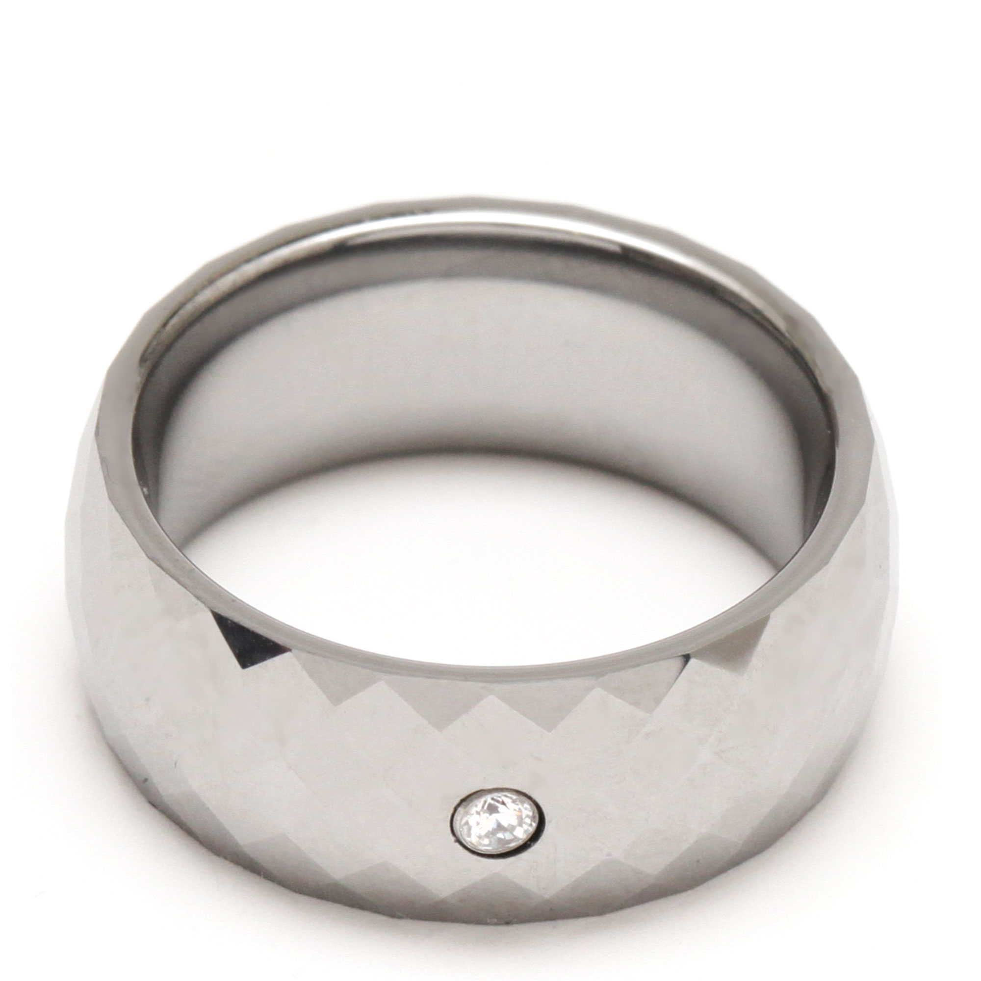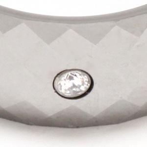 Delicado anillo, en baño de oro blanco de 18 quilates, original diseño con acabado facetado en tono humo e incrustaciones de cristales en color blanco. Fabricado en una estructura de aleación de platino con rodio sin níquel.