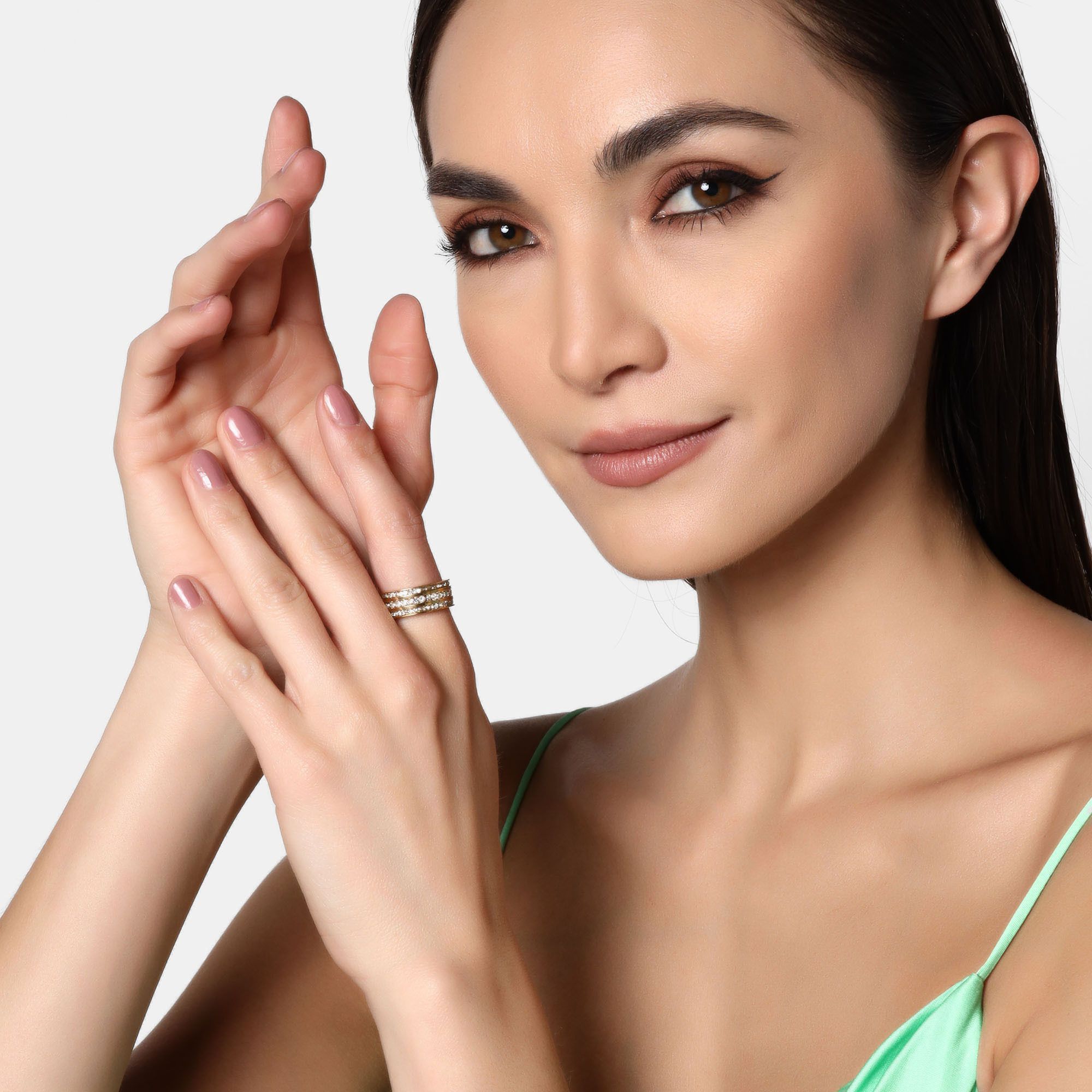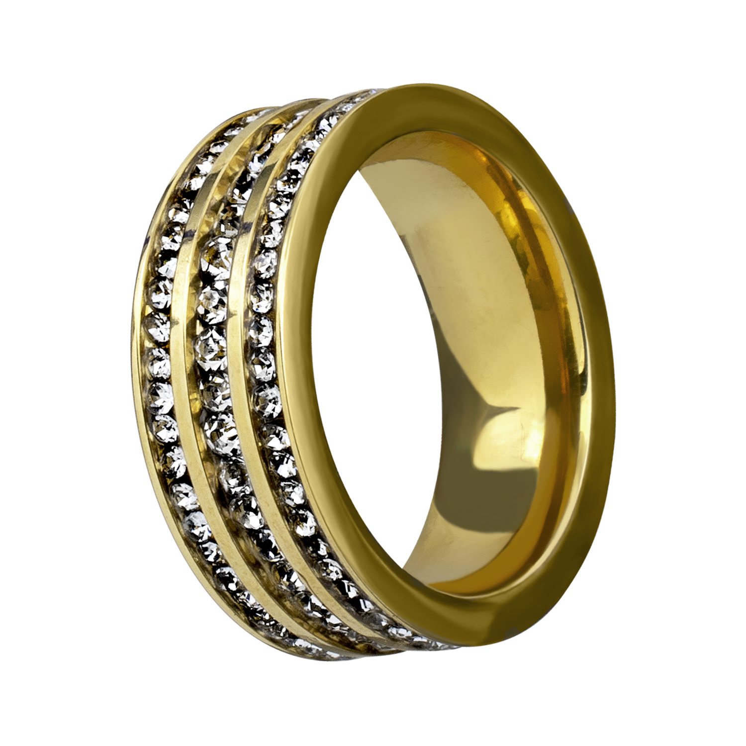 Anillo de acero inoxidable en color amarillo, diseño de triple hilera con incrustación de cristales en color blanco.